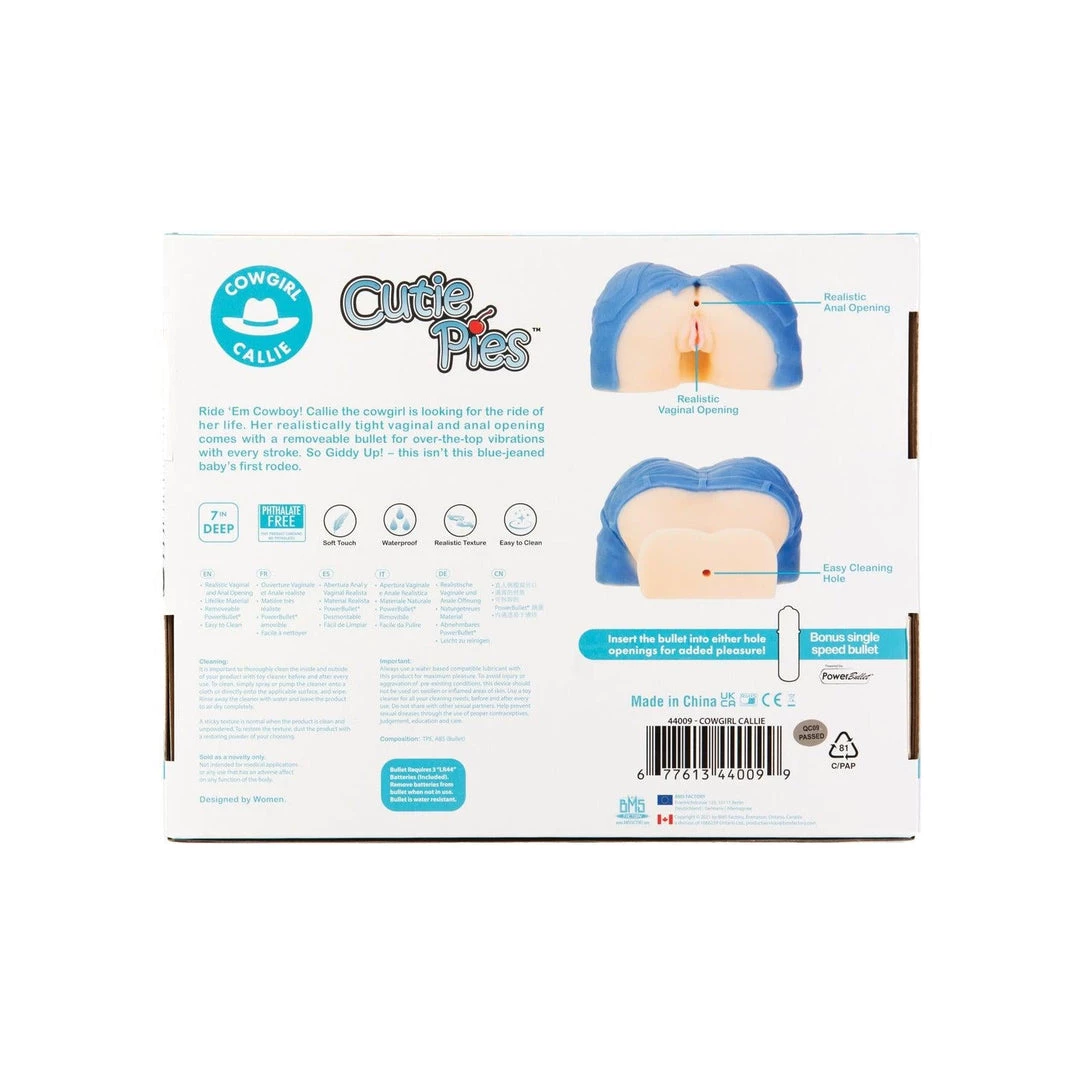 The Cowgirl Callie is a realistic male sex toy shaped like a woman bent over, exposing pussy lips and anal opening. The two channels are realistically designed, with realistic pussy lips, and textured inner surfaces that provide an improved use and satisfaction. The channels are connected and are open-ended, allowing for more comfortable use and easier cleaning and maintenance.