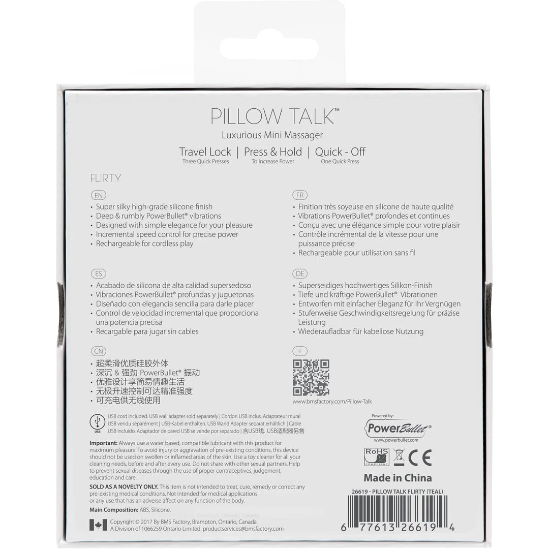 Pillow Talk’s Flirty Bullet is a standalone, stylish and functional mini massager whose added design and performance features, including the contour and finish, make it visually satisfying as well as rewarding to use. Portability and a low charge time yielding longer use is another way in which it can satisfy the user with longer run times and greater opportunities for play. A travel-lock feature means it stays off until you need it and incremental speed/depth of vibration control via a stunning Swarovski set button make it an advanced (as well as stunning) personal accessory. Clean up’s a breeze too, with the advanced latex technology needing just soap and water or toy cleaner before and after each use.