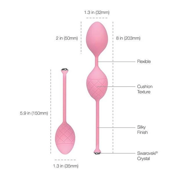 The pack is a progressive set of Kegel balls, with a single and a double set of pleasure balls. The single ball is for beginners, and the double balls are for more experienced users. The silicone casing of the single ball and one of the double balls have a padded cushion textured surface for better grip and stay in place. The ends of the strings have Swarovski crystals encased in them for added elegance and style.