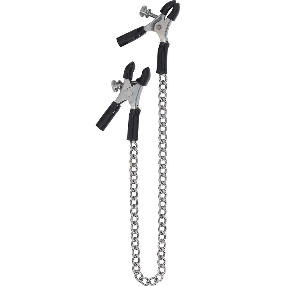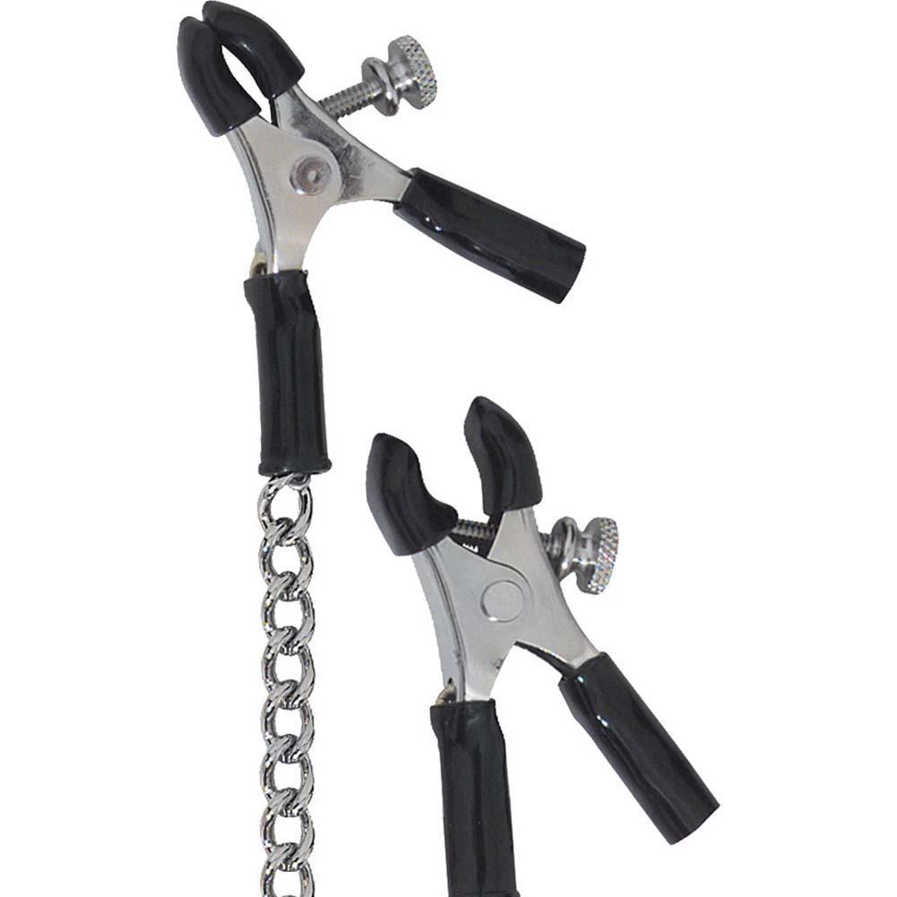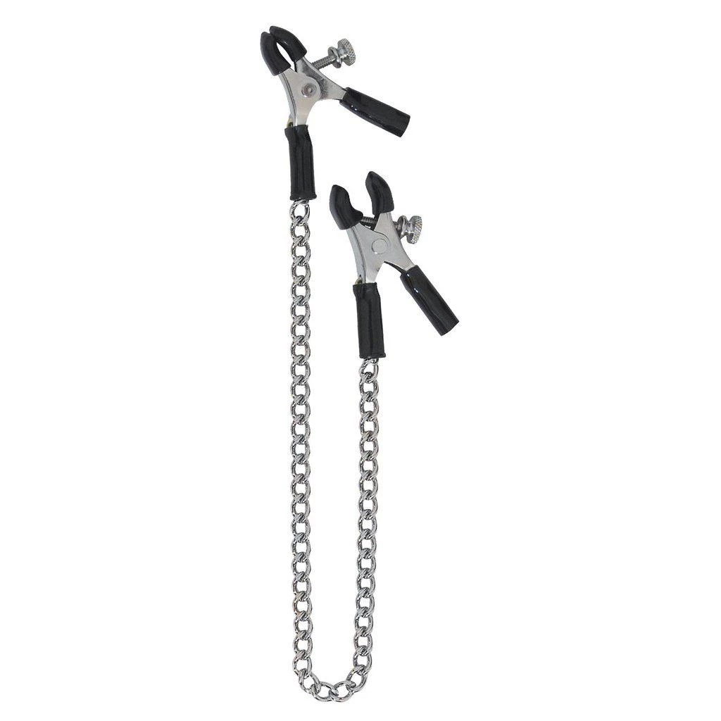 Ideal for use as part of progressive sensory play, your erotic response can be deepened by pulling on the chain or using a vibrator to send delicious shivers through your sensitive nipples. In rubber and nickel-free metal, these nipple clamps should be spot cleaned as needed.