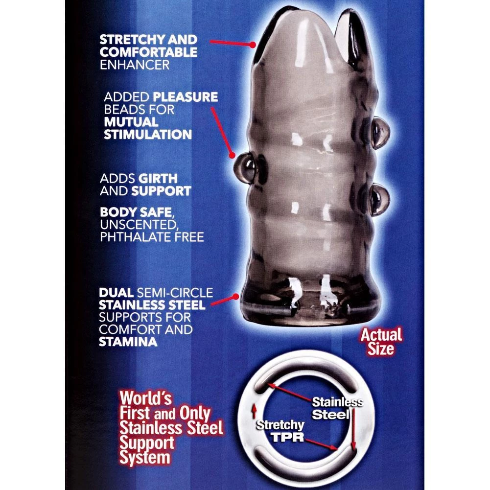 You want to add some extra stimulation, but you don’t want to make it a song and dance show, your partner loves you the way you’re made, but it’s time to shift up a gear for a change, and nothing too weird. The penis girth sleeve doubles as a stimulator with added girth, and also serves as a useful C-ring, fortified at the base with a safe and welcoming design featuring two semi-circles of stainless steel, which allows plenty of stretch and play between them as the sleeve conforms to your ‘member.’