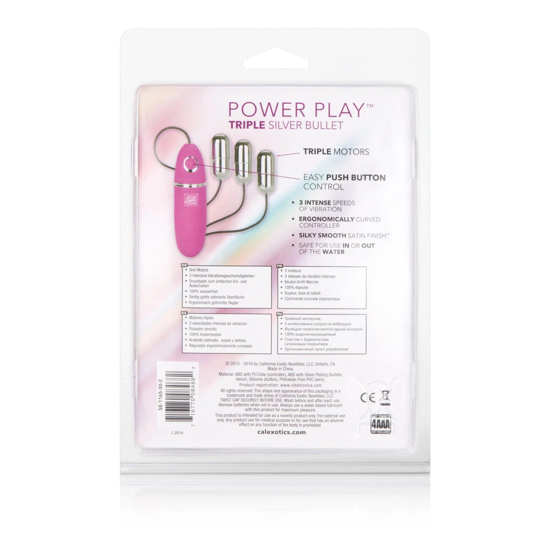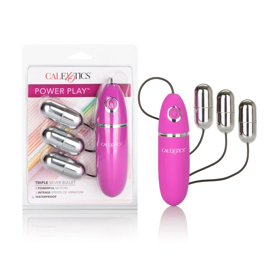 Power up your playtime with this trio of smooth, sleek, and feminine power play playful bullets! These three petite and powerful bullets have a sexy allover shine that’ll drive you wild with anticipation as you press them against your favorite spots – or let your partner take control. Their silver accent rings add an air of glamour and sex appeal, alluding to the powerful pleasure these little bullets promise. The silky-soft, body-safe stimulators feel heavenly rubbing against your lips and clit. And, with 3 intense speeds of orgasmic sensation, you’ll hardly be able to pull them away!