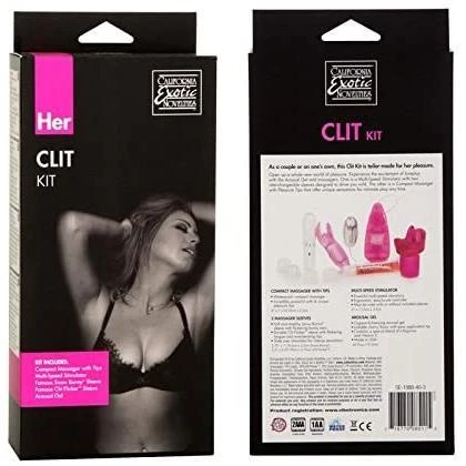 Made by California Exotic Novelties, Her Clit Kit is a kit of several toys designed for clitoral stimulation. The kit has a powerful compact massager with four pleasure tips made from TPU material. The massager is a bullet vibe on which the variously shaped massage tips attach. It runs on a single AA battery not included in the package.