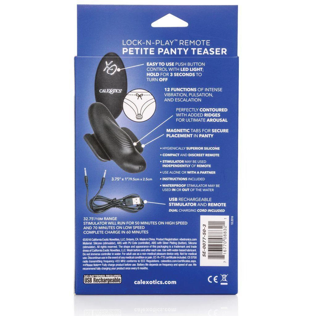 The Lock-N-Play™ Remote Petite Panty Teaser is a powerfully petite massager paired with a playfully discreet controller for adventurous pleasure seekers. The stylish, yet discreet controller makes it easy for you or your lover to control vibration intensity with the touch of a button. Whenever or wherever passion takes you, this passionate panty vibrator’s 32.75-foot radius range and 12 intense functions of vibration are ready for playtime.
