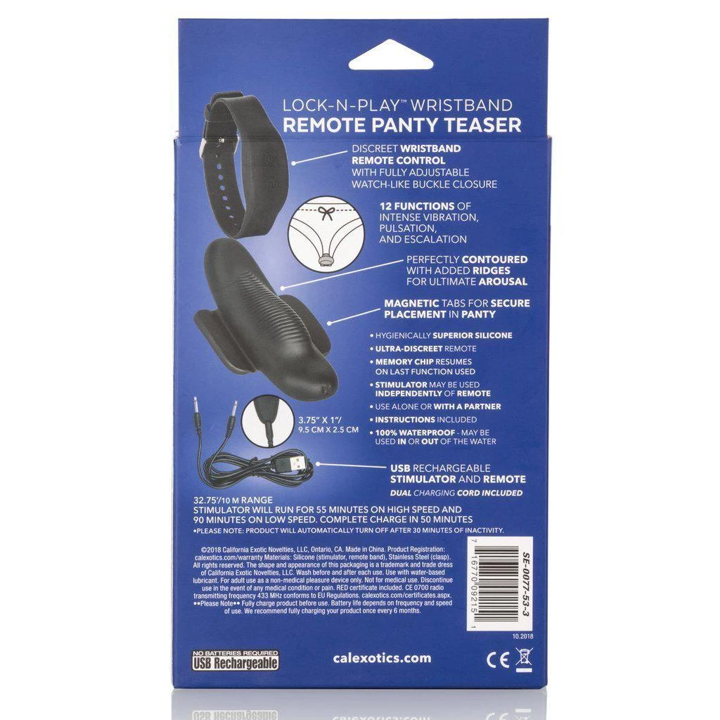The Lock-N-Play™ Wristband Remote Panty Teaser is a powerfully petite massager paired with a playfully discreet wristband controller for adventurous pleasure seekers. The stylish, yet discreet wristband controller makes it easy for you or your lover to control vibration intensity with the touch of a button.