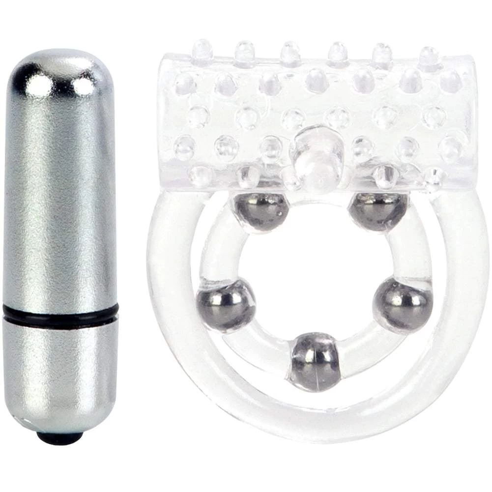 A penis ring vibrator with soft, sensual and stretchy double enhancement ring for support for him, with a top mounted, wireless, mini vibrating bullet and stimulating clitoral love nodules give her the ultimate thrill!