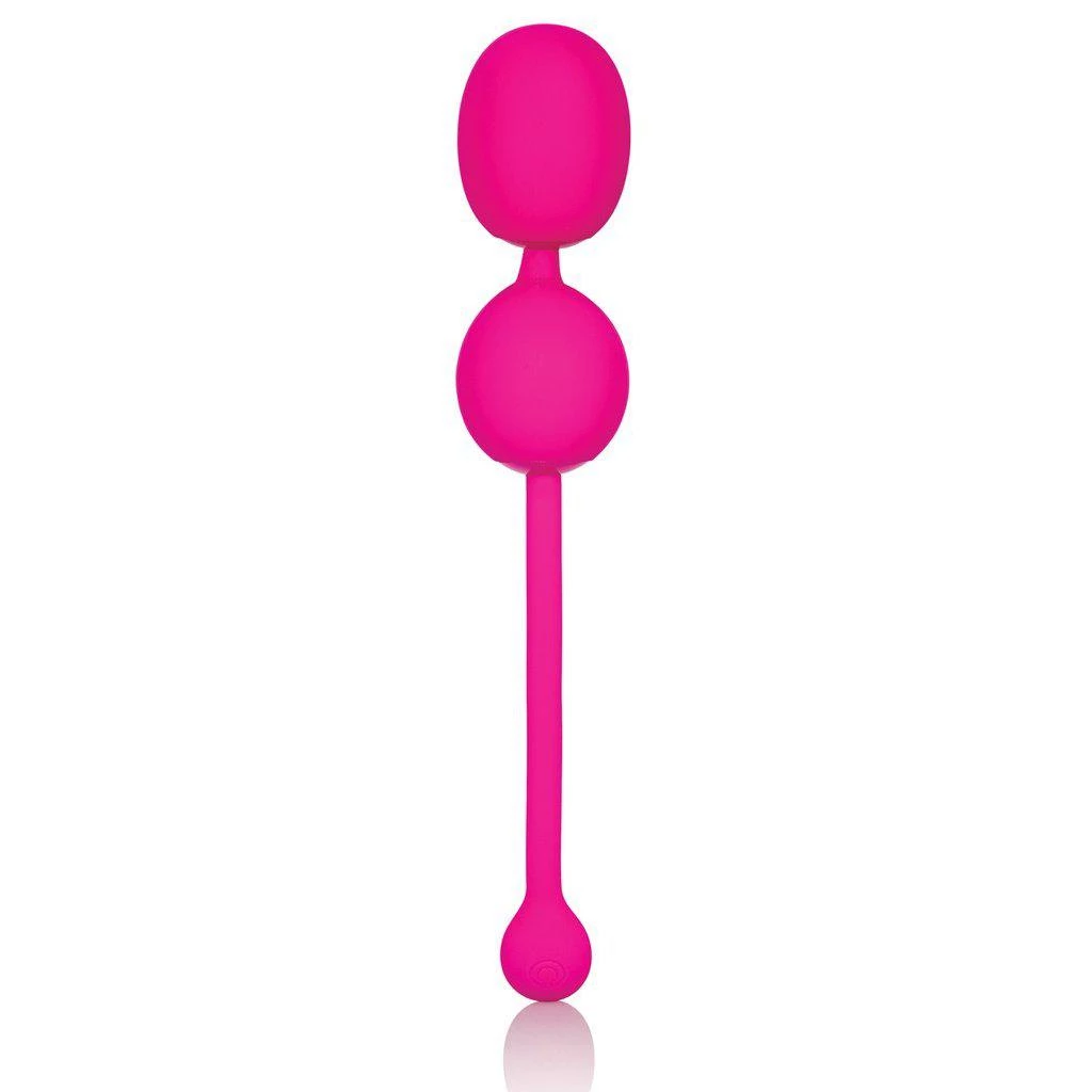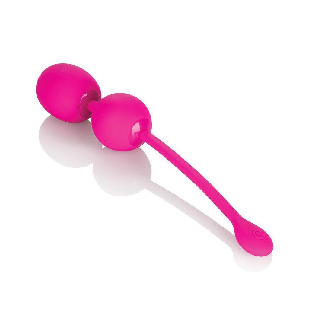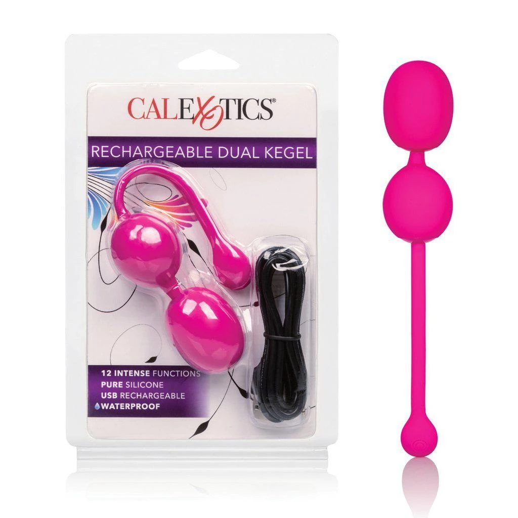 The Dual Rechargeable Silicone Kegel Balls are one of the many adult toys California Exotic Novelties makes. The Dual Kegel balls are encased in pink, phthalate-free, plush silicone that is unscented and body-safe. The two balls are connected with a silicone string and have a flexible retrieval cord.