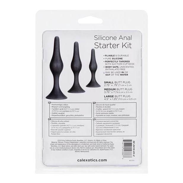 Ease yourself into thrilling anal sensation with the Silicone Anal Starter Kit. This naughty kit includes a set of 3 graduated tapered anal plugs meant to let you safely and comfortably increase passionate anal stimulation. To enjoy everything the exhilarating world of anal play has to offer, training is in order to ensure total safety and satisfaction. Each probe in this kit gradually increases in length and girth for superb pleasure at any level of pleasure play. Great for beginners and advanced players alike, this set will take your anal play to the next level!