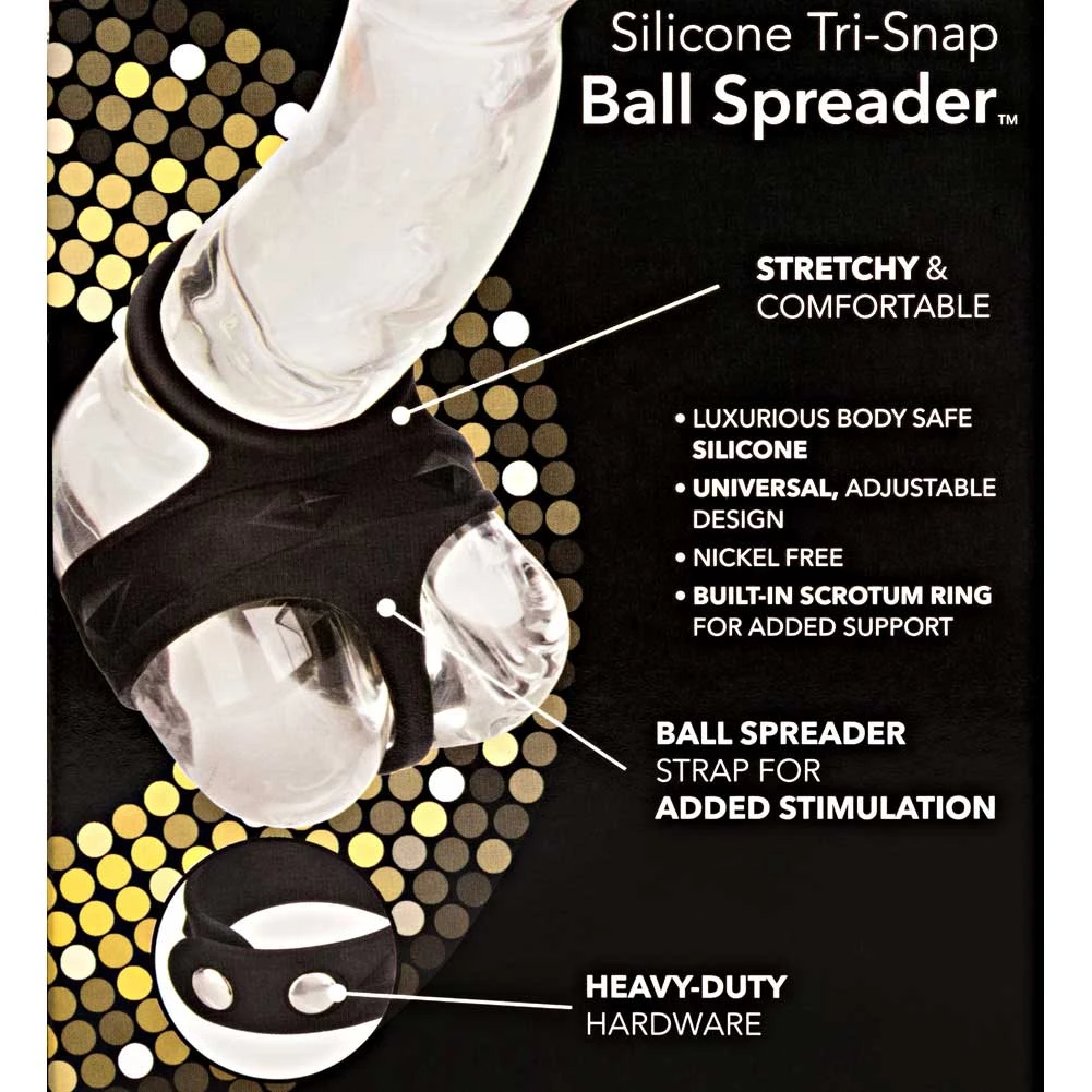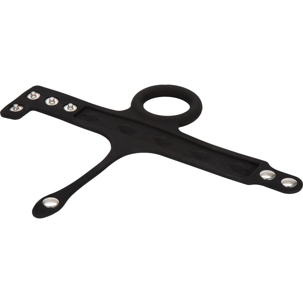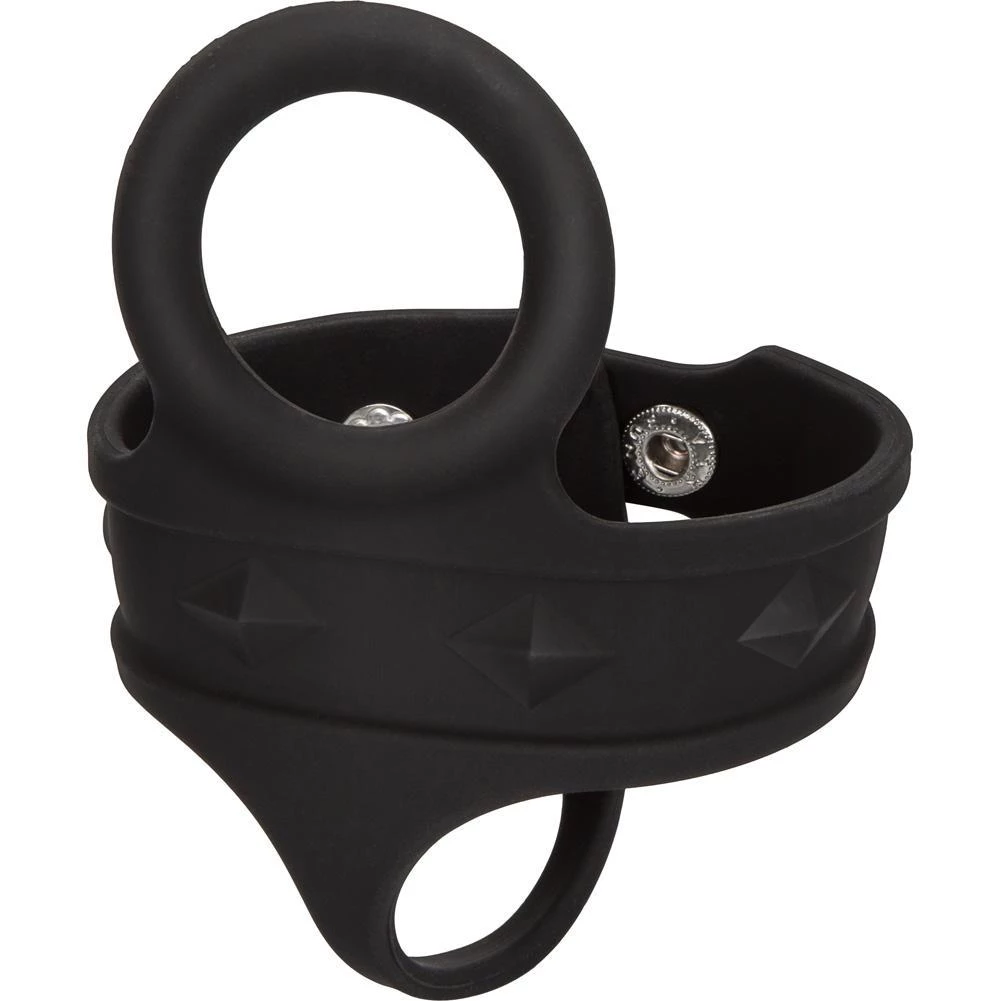 No fuss, stretchy, silken silicone, it all comfortably houses your ‘member,’ stretching with you as you get hard while retaining a safe level of pressure, keeping you harder for way longer. A wide, triple-studded scrotum band supports you further from below, which has its own ball separating strap, fully adjustable with simple, snap-lock buttons. This is an awesome piece of hardware; the tri cock ring rig is made to enjoy and to show off.