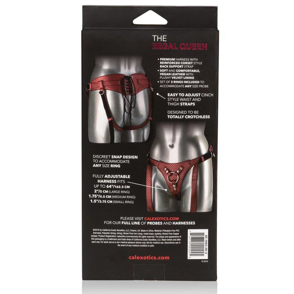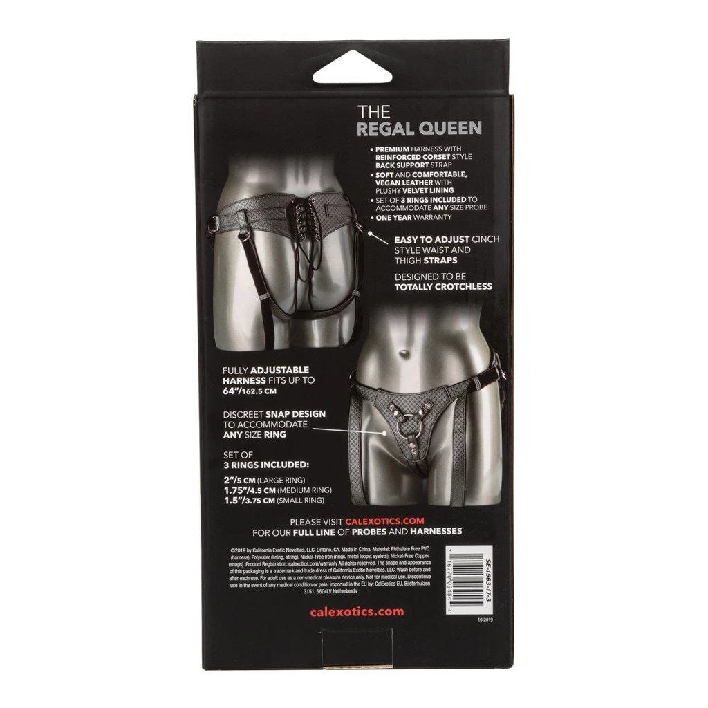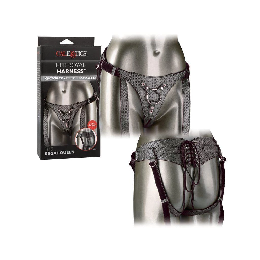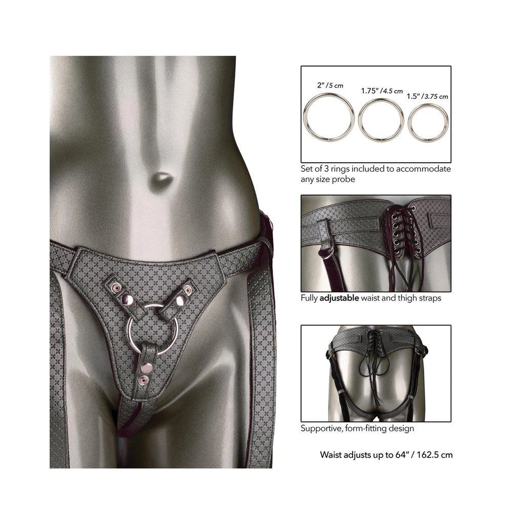 Prepare yourself for indulgent pleasure and premium probe play truly fit for royalty with The Regal Queen. The Her Royal Harness luxurious harness is made for a performance and comfort with a corset-like lace design, plush velvety lining and adjustable buckle enclosure. The bold crotchless design appeals to even the most dominant with the discreet snaps made to accommodate any size probe ring. The designer vegan leather, corset style details and plushy velvet liner give you the ultimate control over comfort.