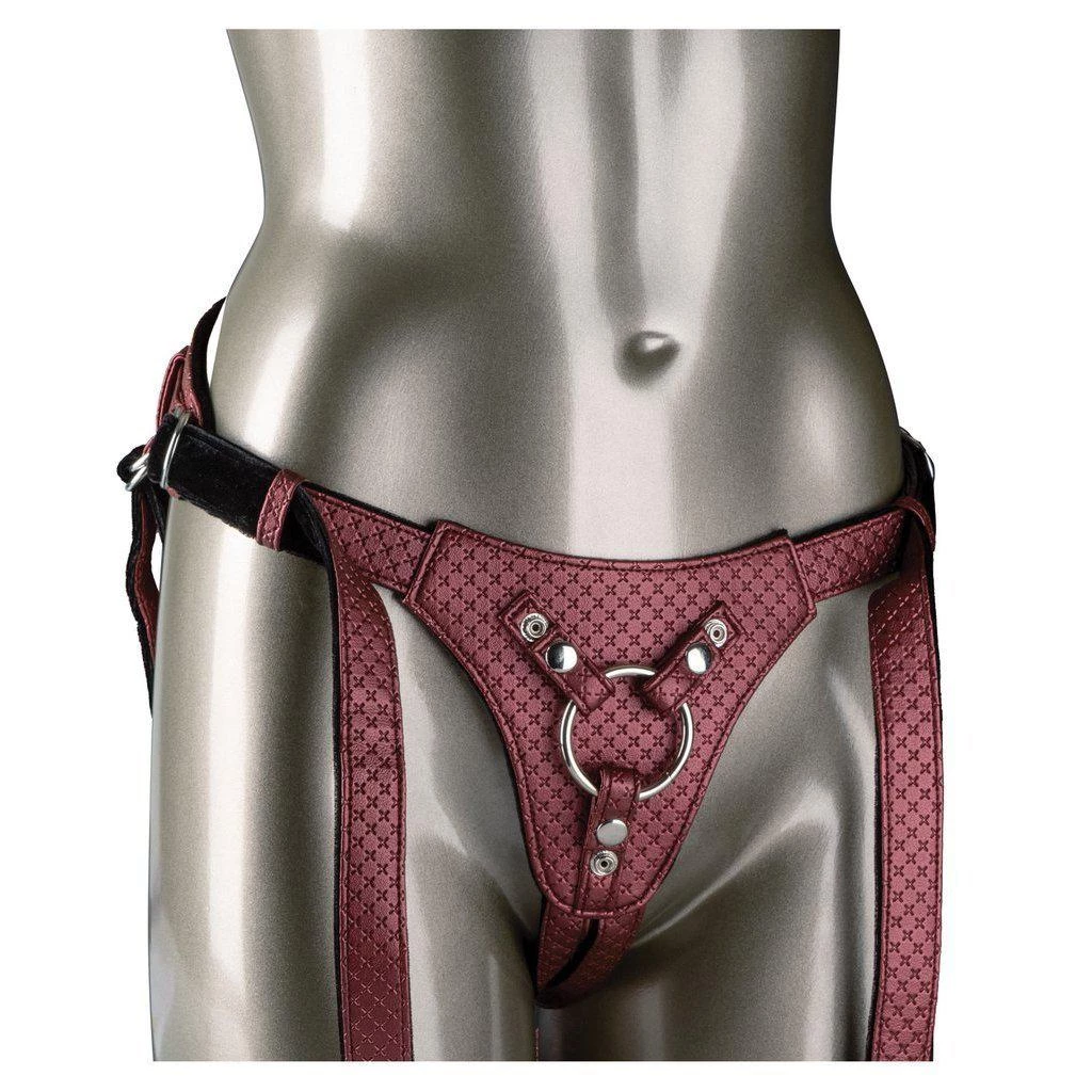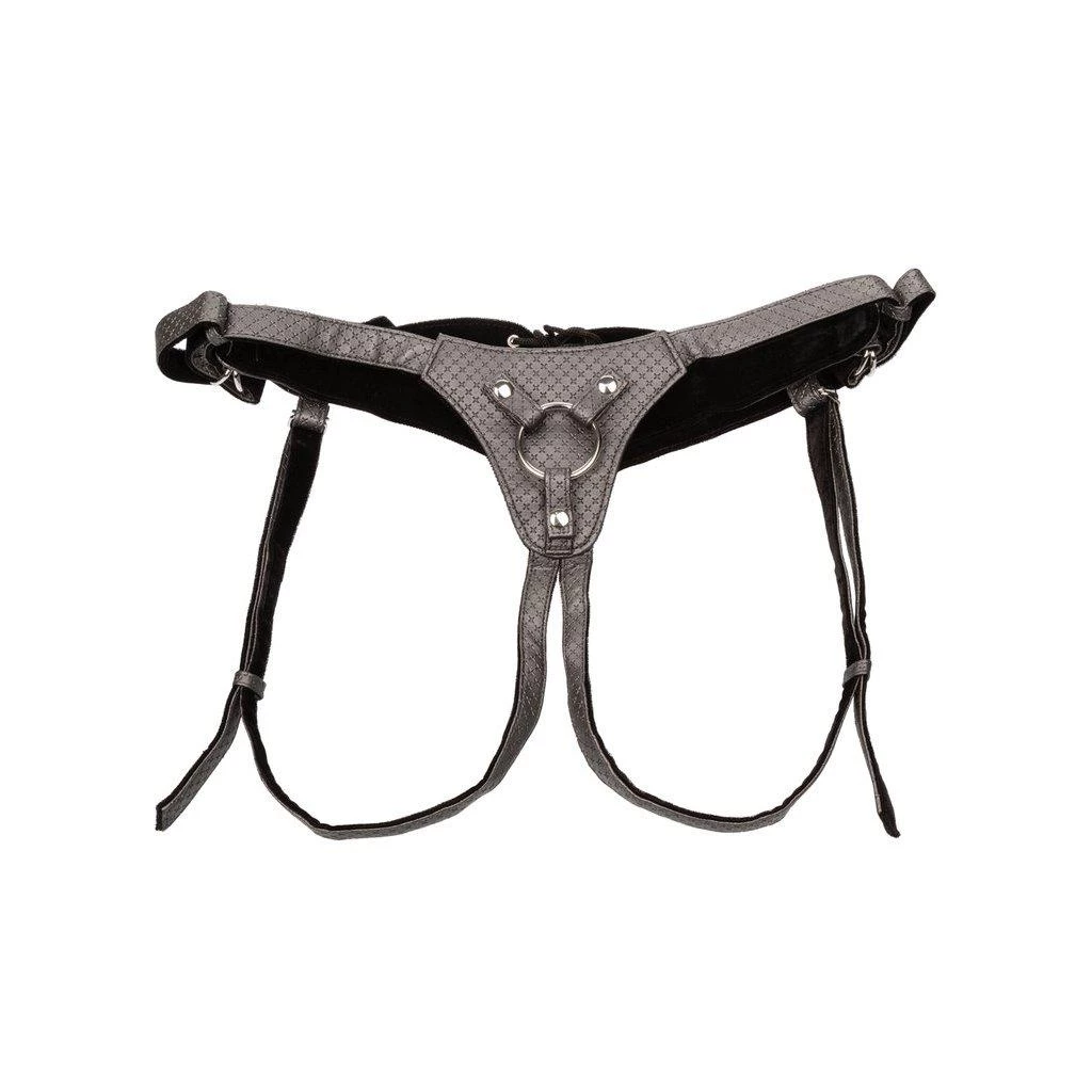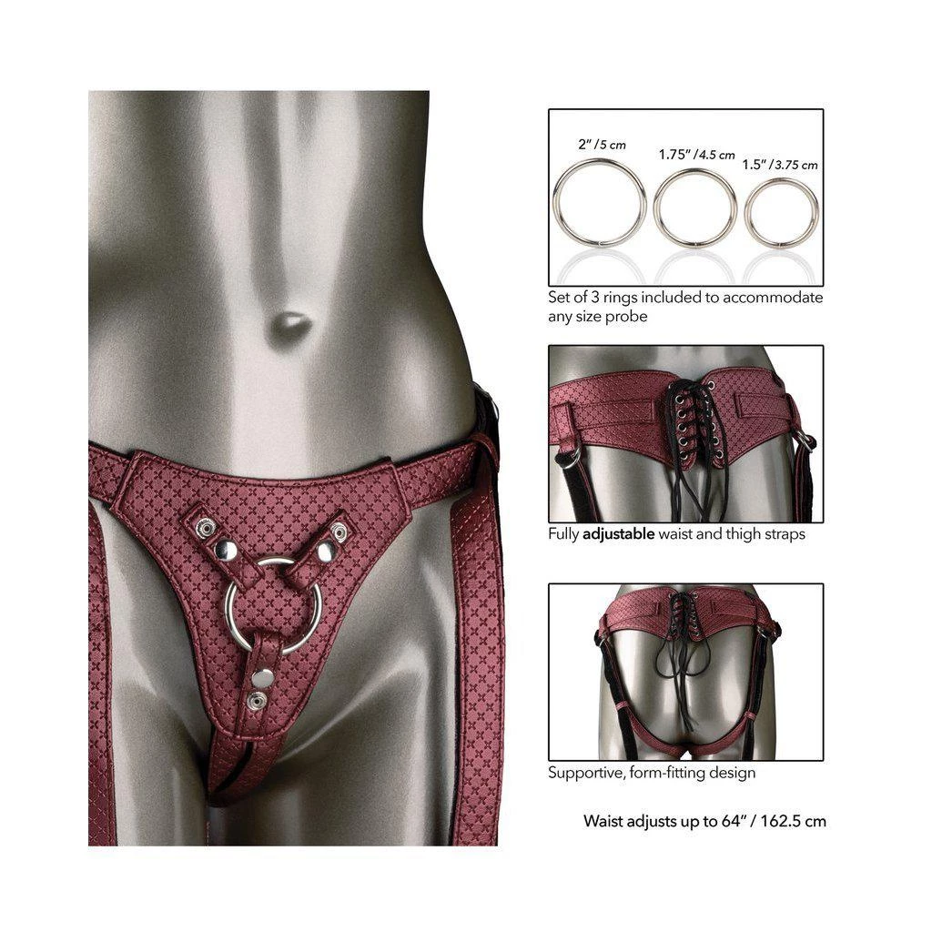 - Plush fabric, fully adjustable corset style harness rig with O-rings that fits dildos requiring 1.5, 1.75 and 2 inch O-rings
