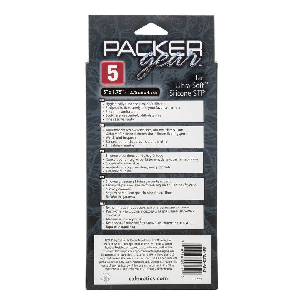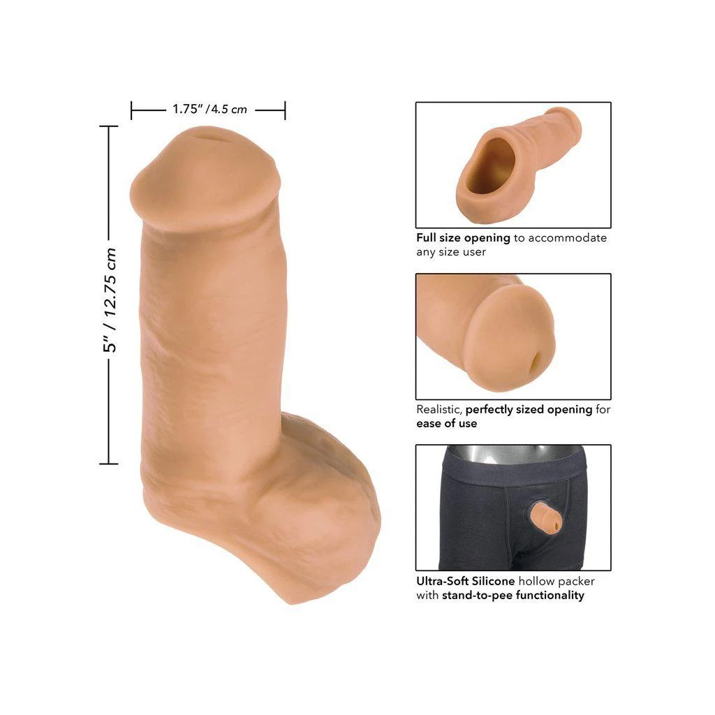 A packer dildo, this product is an ultra-soft silicone dildo designed for STP (stand-to-pee); it comes with a hollow shaft and wide opening for an easy STP function. It is five inches in length and fits in most packer harnesses. This prosthetic penis is not intended for active sexual play but only for STP use.