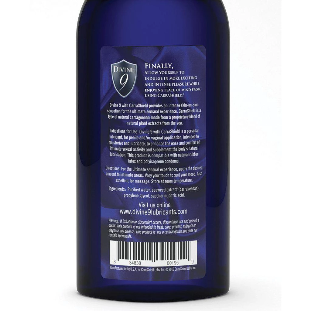 Divine 9 is the first and only personal lubricant undergoing government-sponsored studies on its ability to provide protection against HPV. Divine 9 is a water-based lubricant made with a unique plant extract that may act as a protective barrier to prevent HPV from attaching to the cells of your body. In addition to all the potential health benefits, the natural sea plant extracts called CarraShield creates a slippery yet intimate feel that will enhance your pleasure. Divine 9 personal lubricant with CarraShield provides an intense skin on skin sensation for the ultimate sensual experience. Features: Divine 9 is fragrance, paraben, and glycerin-free, non-staining, long lasting and compatible with latex and polyisoprene condoms. Made with natural ingredients that moisturize your skin and are never irritating. Dries clean without becoming sticky or tacky. Directions: For the ultimate sensual experience, apply the desired amount to intimate areas. Vary your touch to suit your mood. Also excellent for massage. Warning: if irritation or discomfort occurs discontinue use and consult a doctor. This product is not intended to treat, sure, prevent, mitigate or diagnose any disease. Made in the USA.
