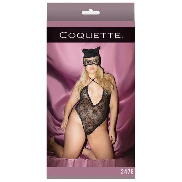 “Kitty” teddy and mask with criss cross neck detail and cutout back detail.
