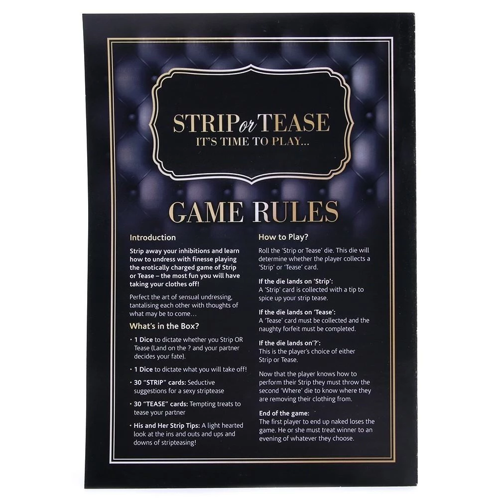 Unleash the inner God and Goddess in each other with the erotically charged game of Striptease. Striptease will help you perfect the art of undressing erotically and sexily, tantalising each other with thoughts of what may be to come… Let the game strip you of your inhibitions and tease each other with the show of a lifetime. It’s time to play…