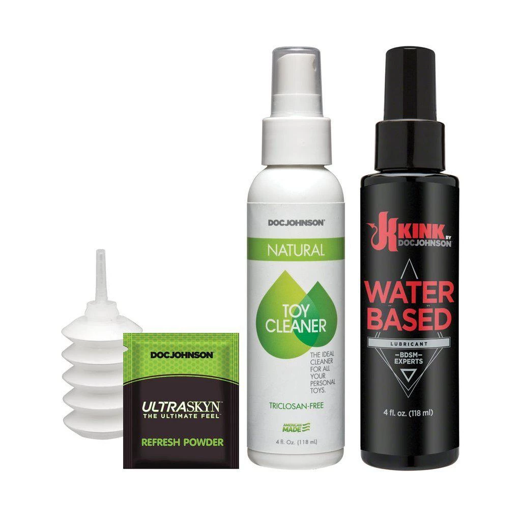The other accessories in the set are a Power Banger extender set with 4-inch and 8-inch sections for a total of 12 inches in length. Next is the hybrid glide liquid for the squirting cock, a pack of Doc Johnson water-based lube, a pack of Doc Johnson natural toy cleaner, a Doc Johnson Vac-U-Powder, and the UltraSkyn refresh powder.
