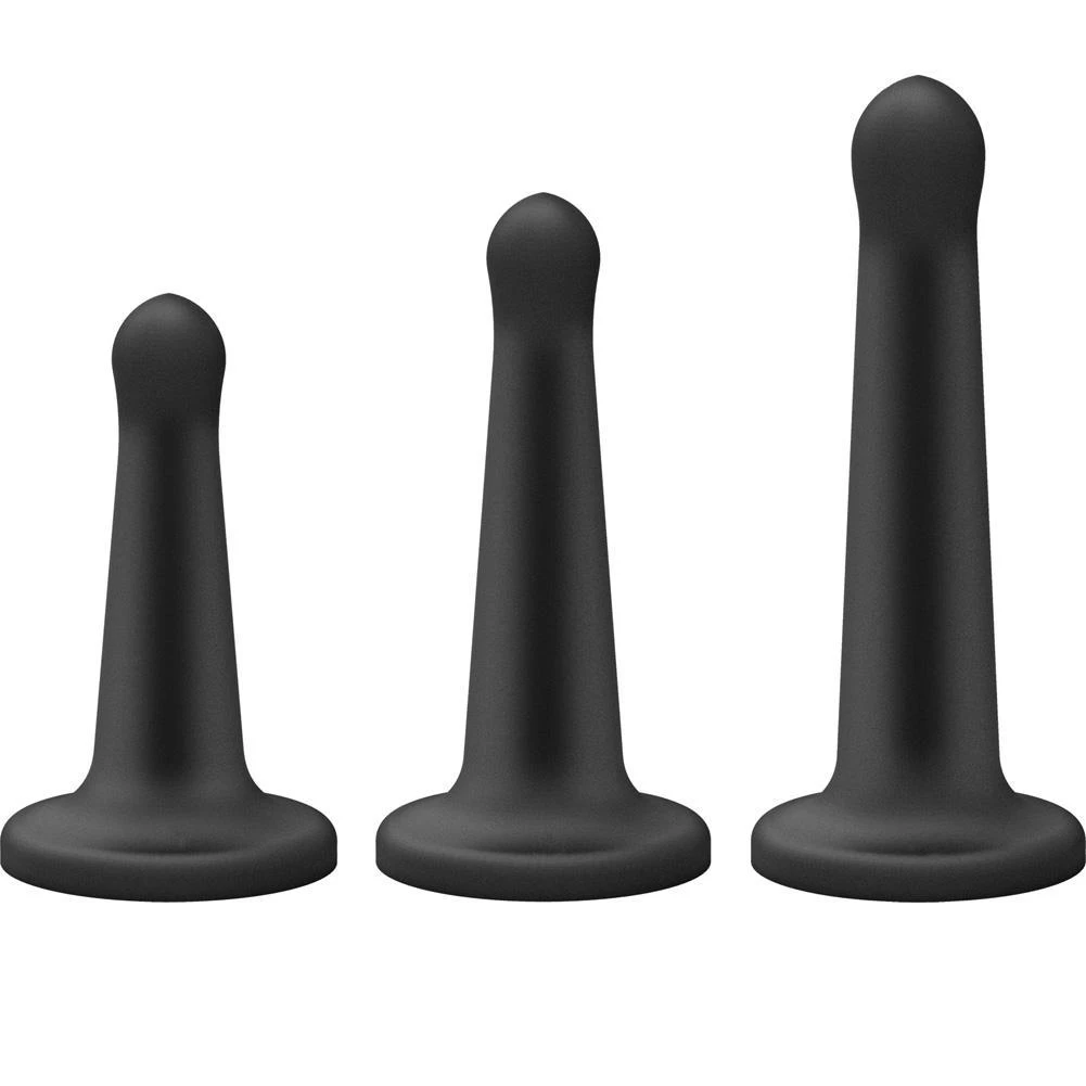 Ready for a role-reversal romp? The Vac-U-Lock Platinum™ Silicone Pegging Set’s three slim, custom-designed attachments in Platinum™ Premium silicone are specially contoured to stimulate the prostate and sized for various levels of experience and comfort. Snap your choice of these smooth, non-anatomical attachments onto the Supreme Harness via the included Vac-U-Lock™ plug, fit the adjustable straps to your body, and apply some of the Mood water-based lube, and you’re ready to explore.