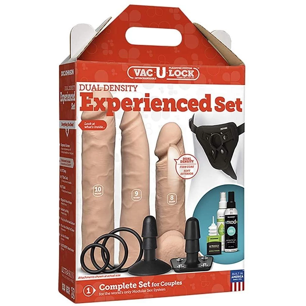The Vac-U-Lock™ Dual Density Experienced Set is an excellent choice for experienced strap-on players and those accustomed to deeper penetration. A complete harness with removable O-rings and plug, three dual density ULTRASKYN™ attachments, and a bottle of Mood water-based lube make an intense strap-on romp as easy as 1-2-3. Featuring the dual density effect–a soft, pliable exterior that gives way to a firm inner core—in lifelike material that warms to the touch, realistic attachments in 8, 9, and 10 inch sizes impart a strong and realistic sensation.