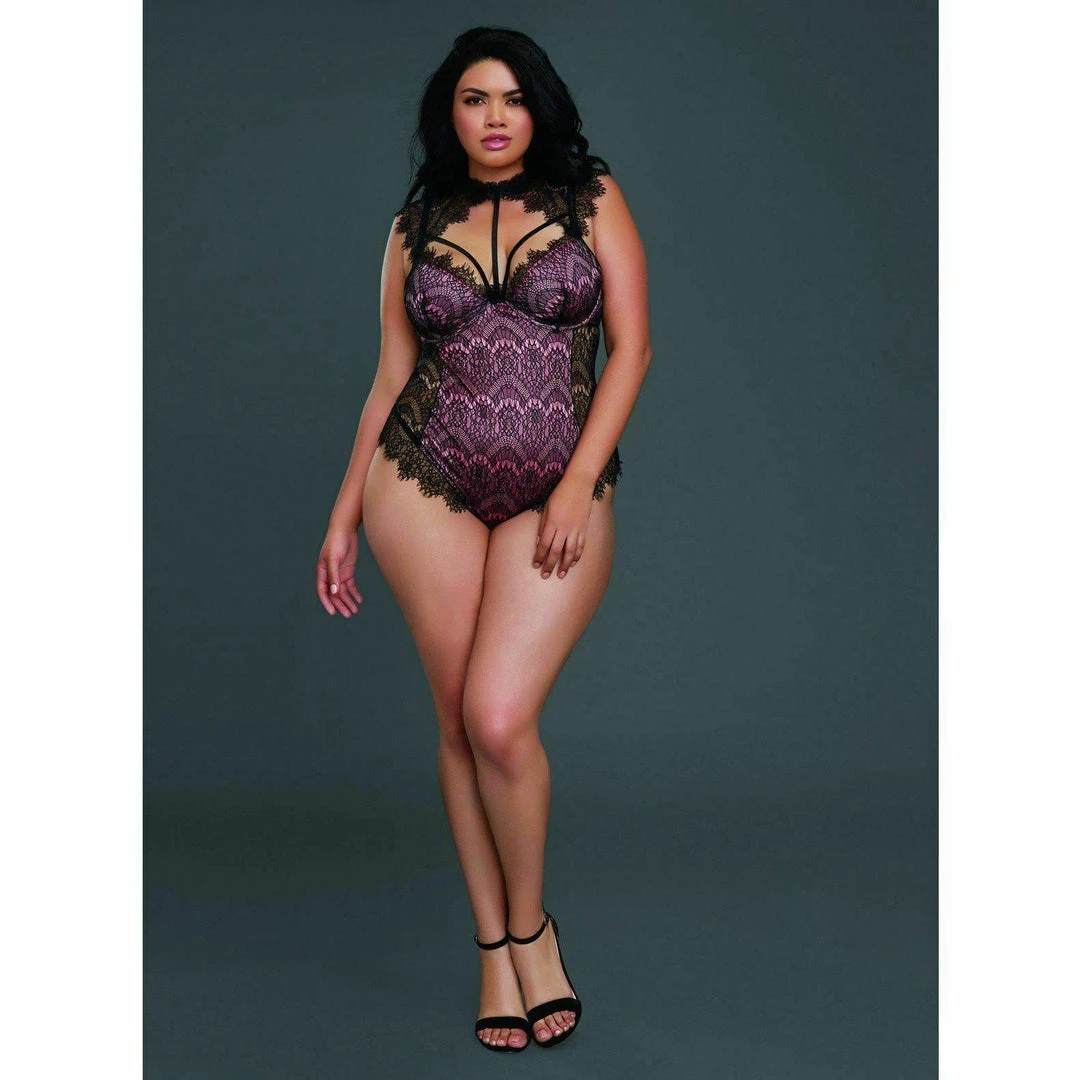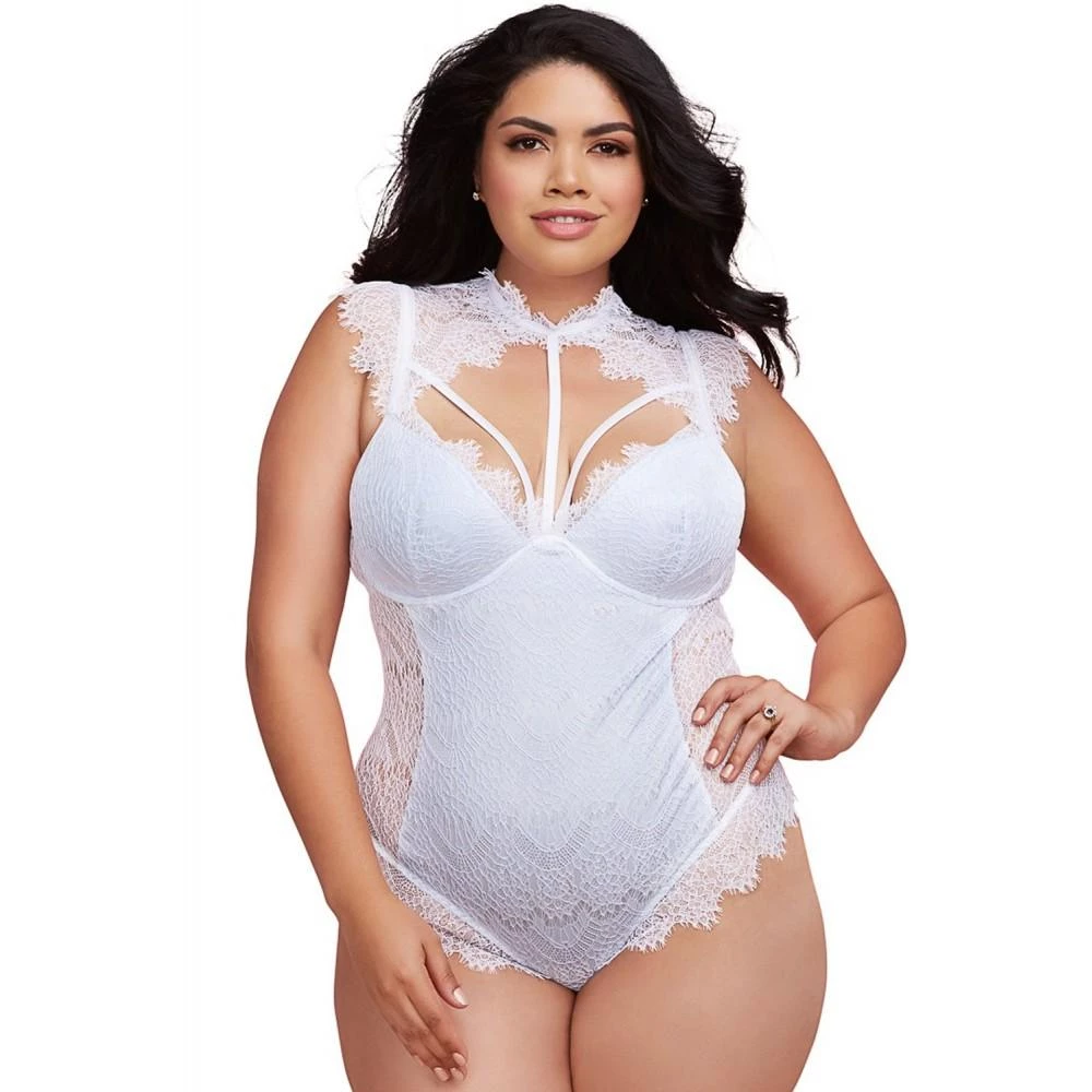 Stretch satin teddy with underwire cups and contrast eyelash lace overlay. Collared teddy features strappy details, lace tie-back collar, snap crotch and cut-out back with hook & eye closure. Lace is 100% Nylon, Satin is 100% Polyester.