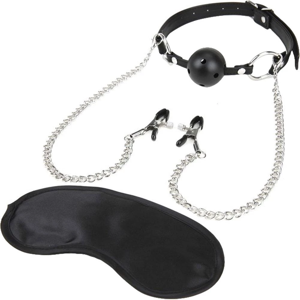 Features: Nipple clamps, ball gag, BDSM, bondage, role play, great for couples, hypoallergenic, phthalate-free, latex-free, includes satin blindfold
