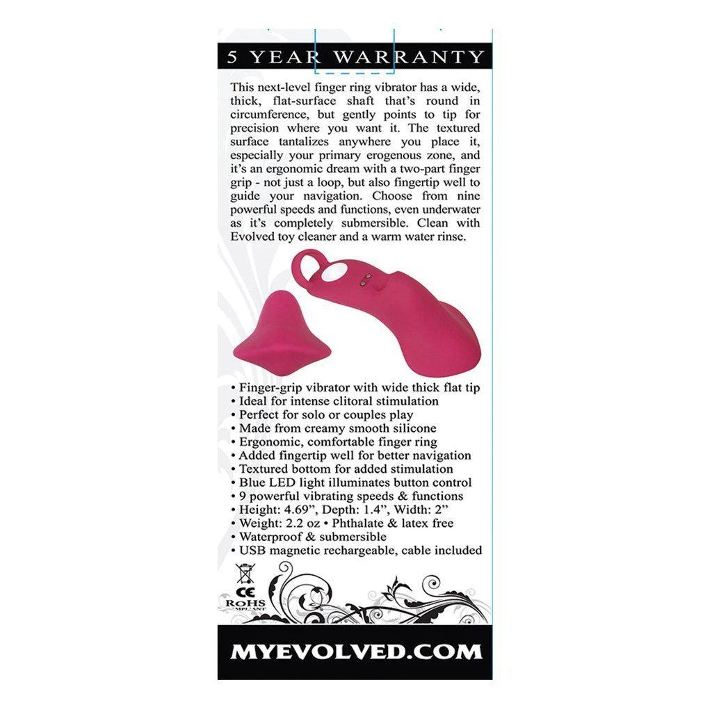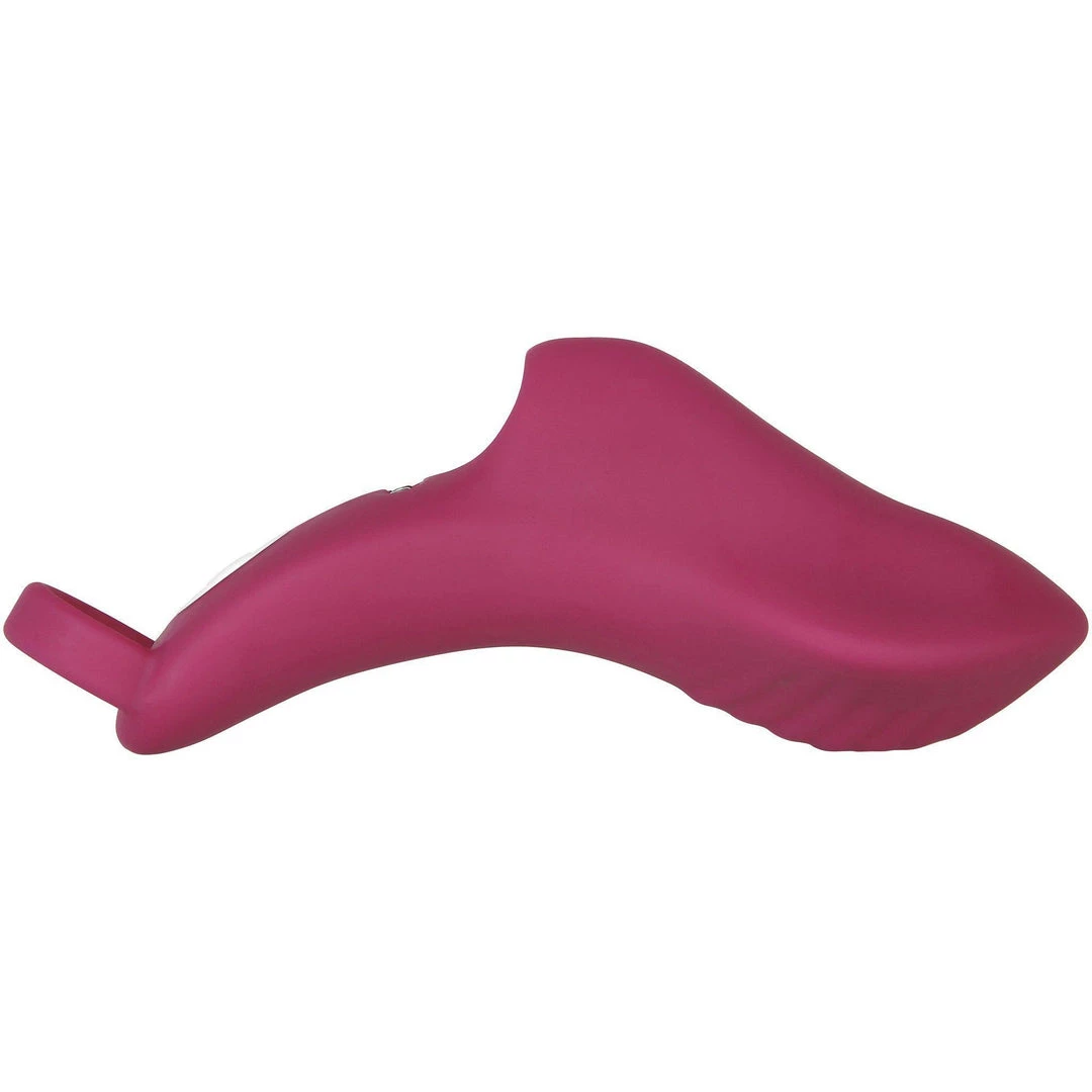 This next-level finger ring vibrator has a wide, thick, flat-surface shaft that’s round in circumference, but gently points to tip for precision where you want it. The textured surface tantalizes anywhere you place it, especially your primary erogenous zone, and it’s an ergonomic dream with a two-part finger grip – not just a loop, but also a fingertip well to guide your navigation. Choose from nine powerful speeds and functions, even underwater as it’s completely submersible.