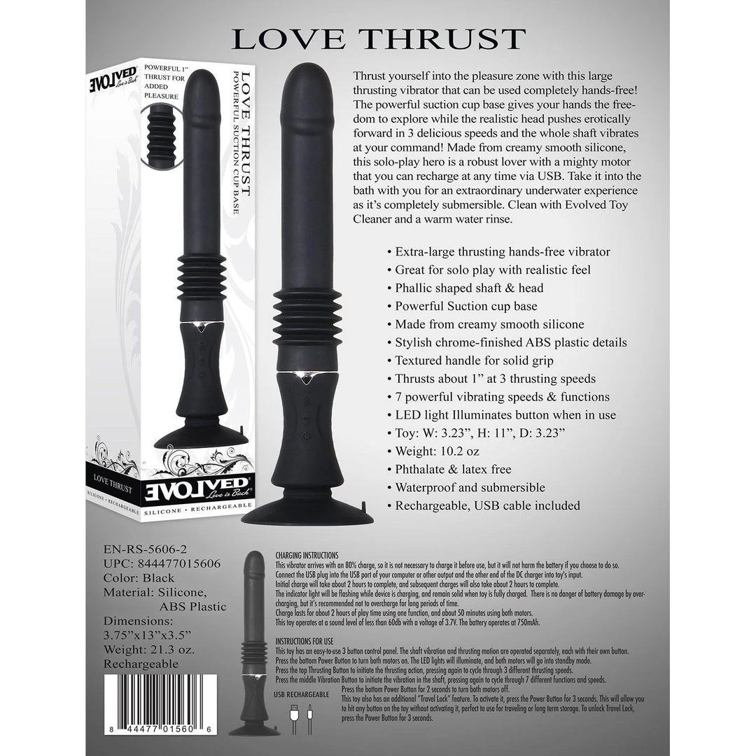 Thrust yourself into the pleasure zone with this large thrusting vibrator that can be used completely hands-free! The powerful suction cup base gives your hands the freedom to explore while the realistic head pushes erotically forward in three delicious speeds while the shaft vibrates at your command! Made from creamy smooth silicone, this solo-play hero is a robust lover with a mighty motor that you can recharge at any time via USB. Take it into the bath with you for an extraordinary underwater experience, as it’s completely submersible. Comes with a generous 5-year warranty for added peace of mind!