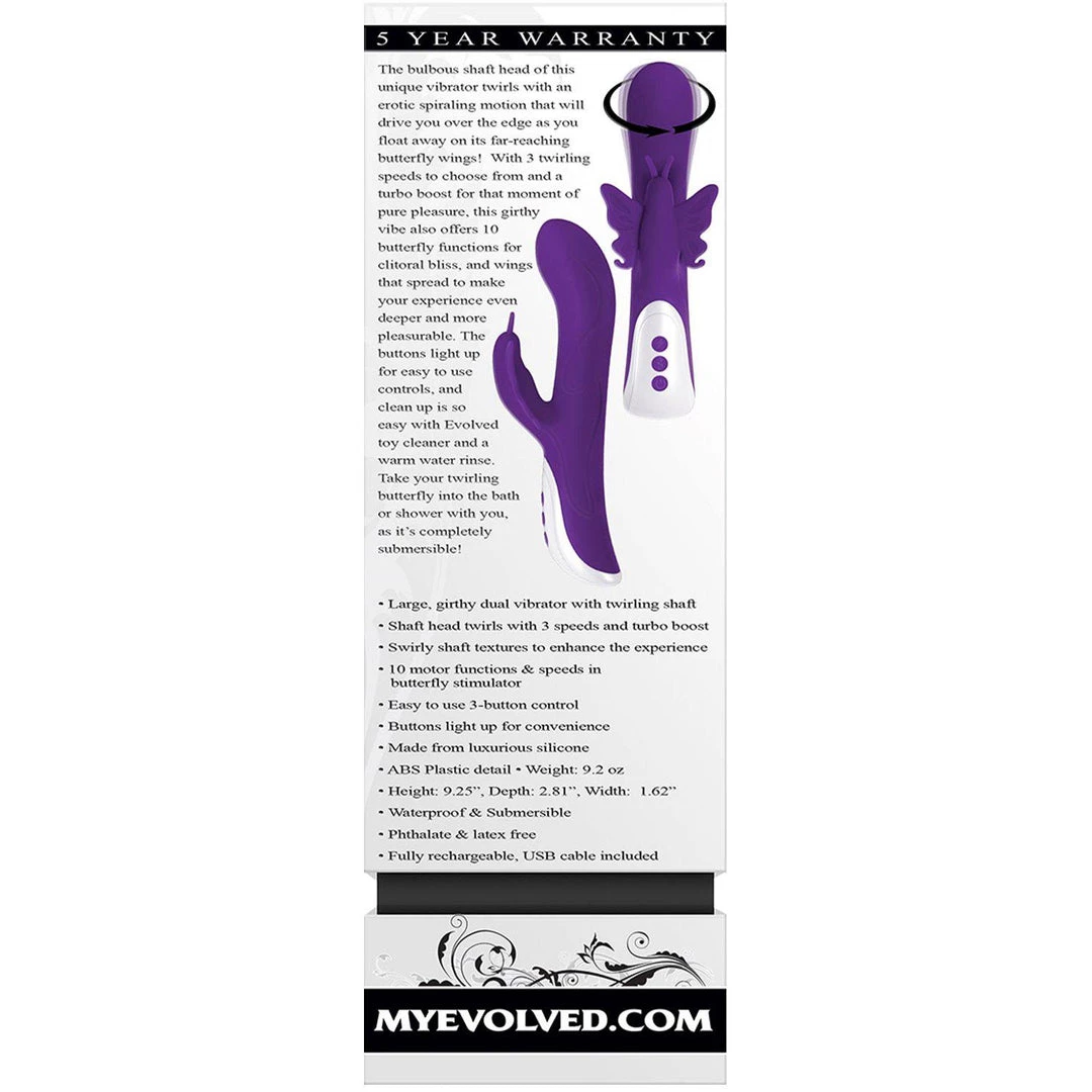 Created by Evolved Novelties Inc, the Twirly Butterfly Rechargeable Silicone Vibrator provides full-body satisfaction. The insertable part of the toy has a bulbous head that twirls with three speeds and a turbo boost speed to make you crazy at the exact moment you need it most. The surface has twirly grooves that improve sensations.