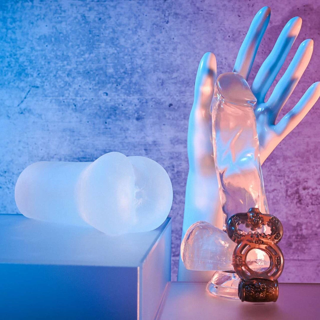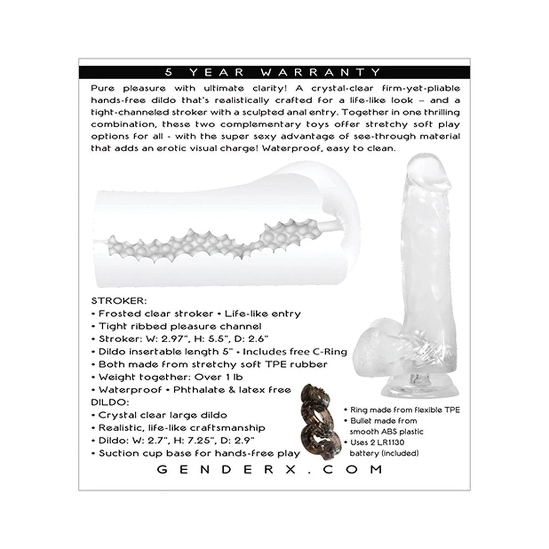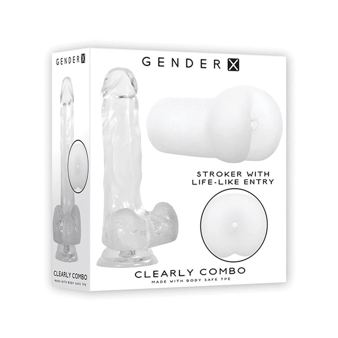 Gender X has many excellent toys in its product catalog, and the Clearly Combo is one of these. The Clearly Combo is a set of one crystal-clear dildo with a suction cup base and an open-ended stroker with an anal opening design. The dildo is made from crystal clear TPE rubber that is firm yet flexible and has a realistic design with a veiny shaft and a pair of balls. Its suction cup base is very sturdy and holds the dildo to most flat surfaces.