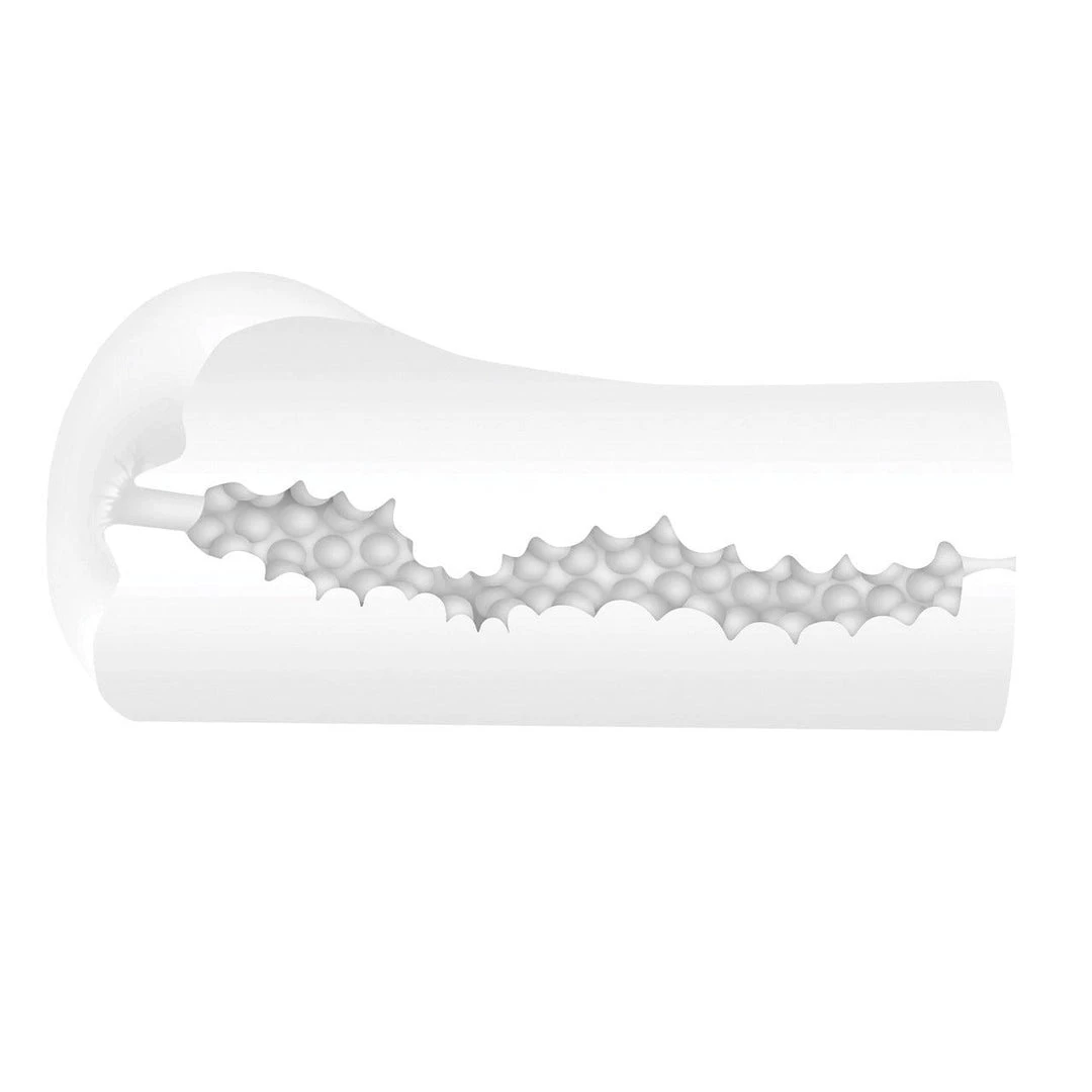 The stroker is made from pliable, stretchy TPE rubber in a frost finish, and it is recommended you use quality water-based lubes with it. The stroker’s entry is designed as a tight anal opening, while the inner channel is highly textured and has an open-ended design. You can control the suction by closing the end of the stroker, and you can add more pressure by squeezing the stroker.