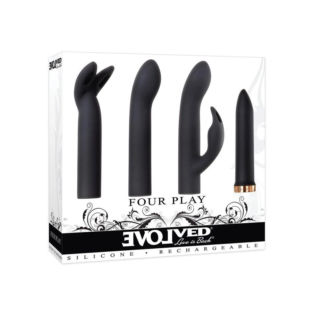 Discover four unique experiences with one versatile toy! Evolved’s workhorse durable 7-speed bullet forms the powerful foundation for your choice of G-spot exploration, dual orgasms and bunny ear clitoral pleasure –not to mention classic bullet play all on its own. There are no wrong decisions, only deep satisfaction from the bullet and three different silicone shapes that slip onto it with ease, even underwater since every combination of Four Play is completely water submersible!