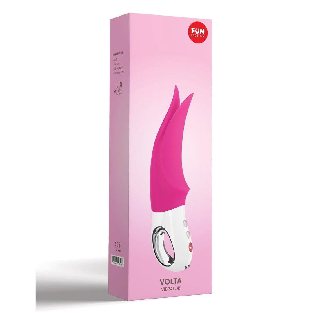 The Volta is an external vibrator, and it has twin fluttering tips that vibrate and stimulate your erogenous zones. The fluttering tips have a dynamic movement that increases or decreases as you press the toy to your body, so you get a light touch when you need it, and you can get more powerful vibrations when you need them. The working end of the Volta is made from body-safe silicone, and the loop handle is made from ABS plastic. The three raised buttons control the six vibration levels and six patterns, and the toy is rechargeable via the provided USB cable. The Volta toy comes with the Fun Factory 2-Year Warranty.