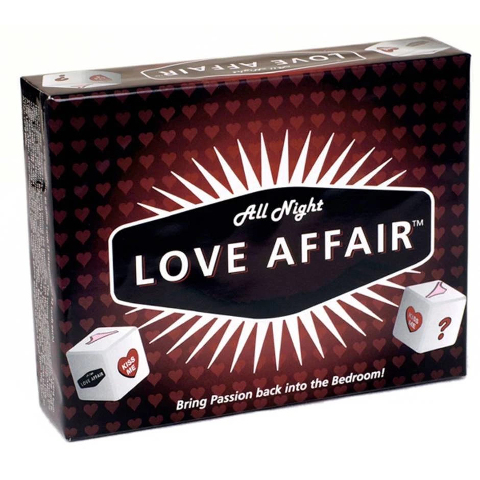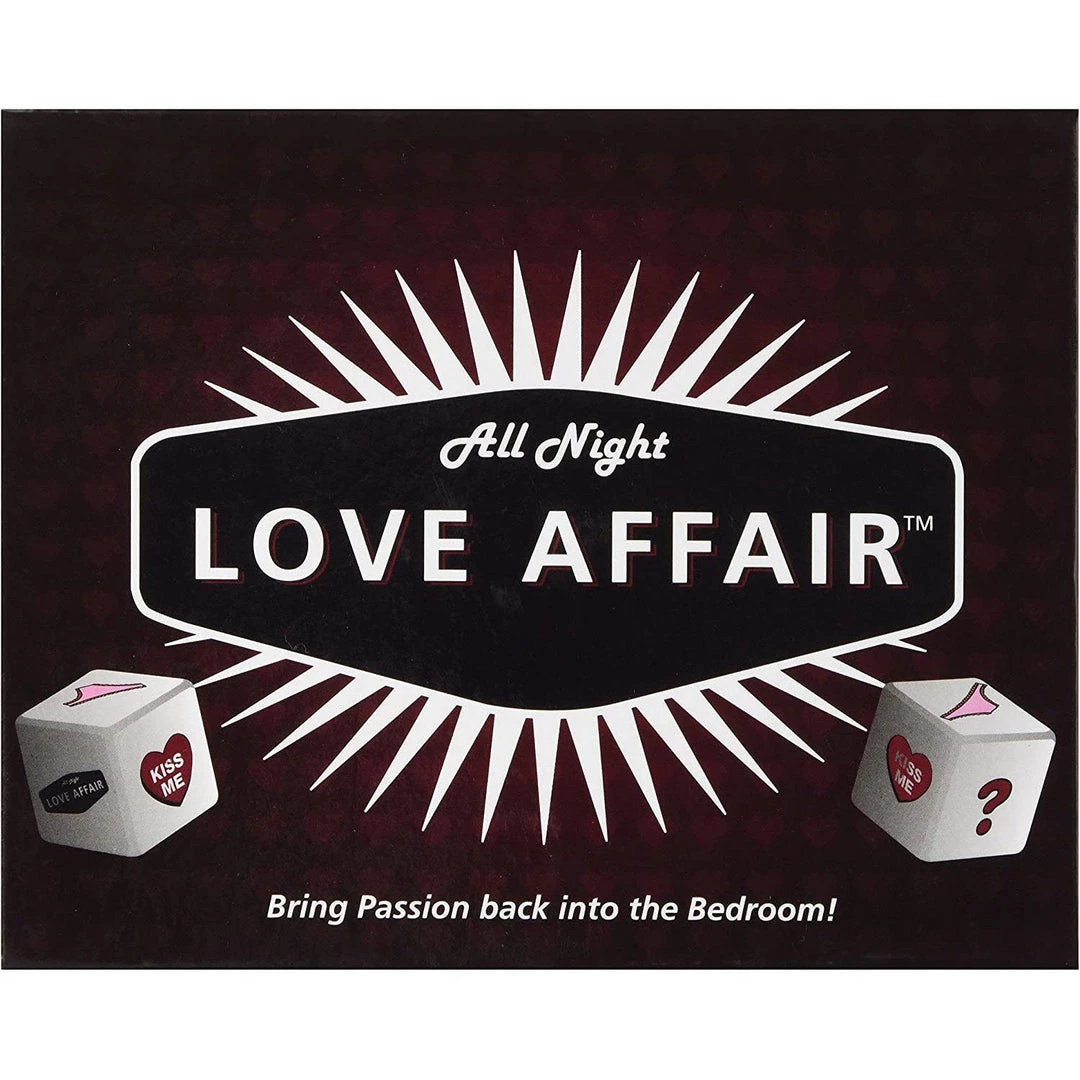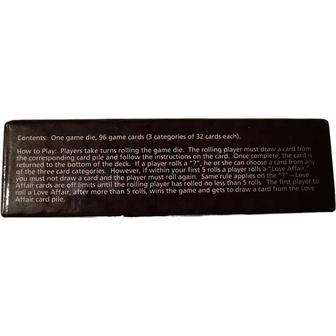 Bring passion back into the bedroom! Just take turns rolling the game die. The rolling player must draw a card from the card pile that corresponds with the picture that landed face up on the die then follow the instructions on the card. Once complete, the card is returned to the bottom of the deck. If a player rolls a “?”, he or she can choose a card from any category. Love Affair cards are off limits until the rolling player has rolled no less than 5 turns. The first player to roll a Love Affair after their 5th roll wins the game and gets to draw a card from the Love Affair pile.