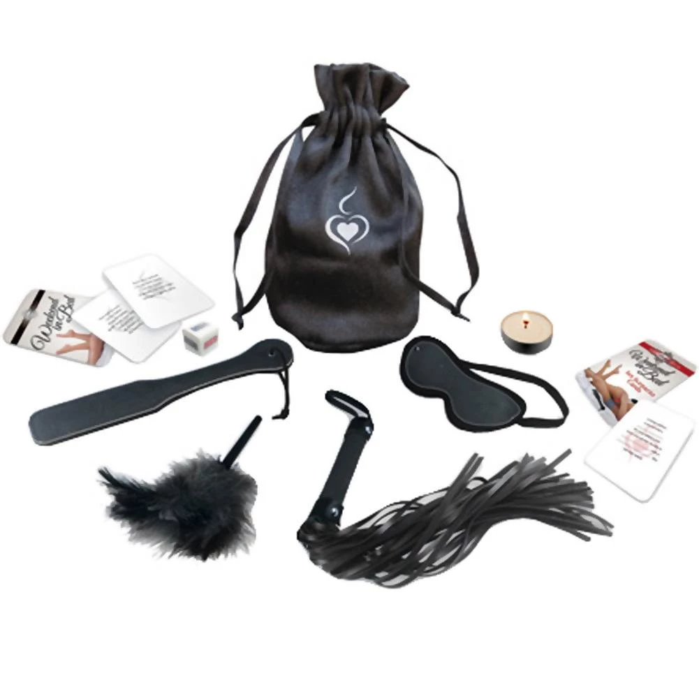 Includes: 2 Adult Card Games that incorporate your new Items, Satin Carry Bag, Paddle, Feather, Blindfold, Flogger, and Candle. From Little Genie.