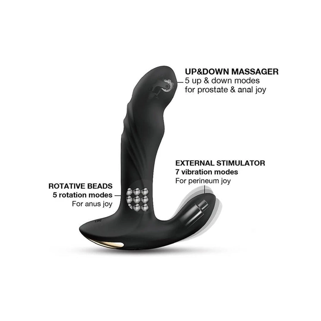 The Dorcel Multi P-Joy Prostate Massager is anatomically correctly designed to fit and stimulate the male body perfectly. The shaft is semi-flexible, and the base is firm, staying in place for solo play. The Multi P-Joy has three distinct features that can be used solo or simultaneously to bring any man to orgasmic bliss by targeted P-Spot stimulation. The shaft has up-and-down movement, the base of the shaft has rotating beads for anus joy, and the base vibrates for perineum joy. The toy is body-safe, made from silicone, and compatible with water-based lubes. Also, it is USB rechargeable and controlled via the button interface on the base or the wireless remote controller.