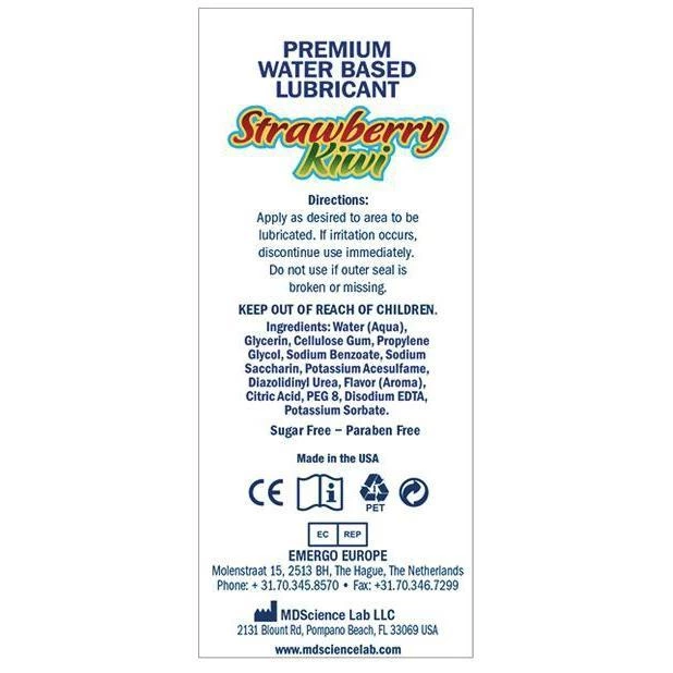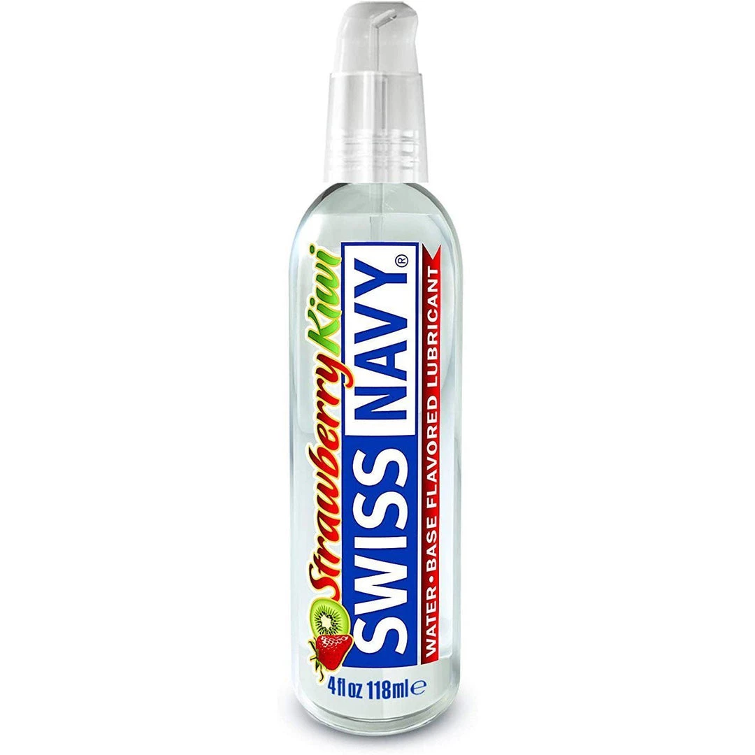This Swiss Navy Premium Water-Based Lubricant is deliciously long-lasting! Use Swiss Navy’s Flavored water based lube for tasty adult play. It is non-staining so use as little or as much as you want. This slick lube is sure to add some pizzazz to your tired sex routine. Plastic bottle with pump lid holds 4 ounces of clear Strawberry Kiwi lube. Swiss Navy gear for play!