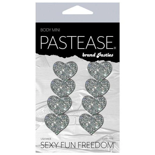 Body Minis: 8 Mini Glitter Hearts are hand-made in the USA of durable, no-mess glitter pleather material that forms to curves and resists wrinkling over hardening nipples. Just peel-and-stick on clean, dry skin! All Pastease feature latex-free, medical-grade, waterproof adhesive that stay securely in place for as long as you like and until they are gently removed. Dimensions: 1 inch wide x 1 inch high. Silver.
