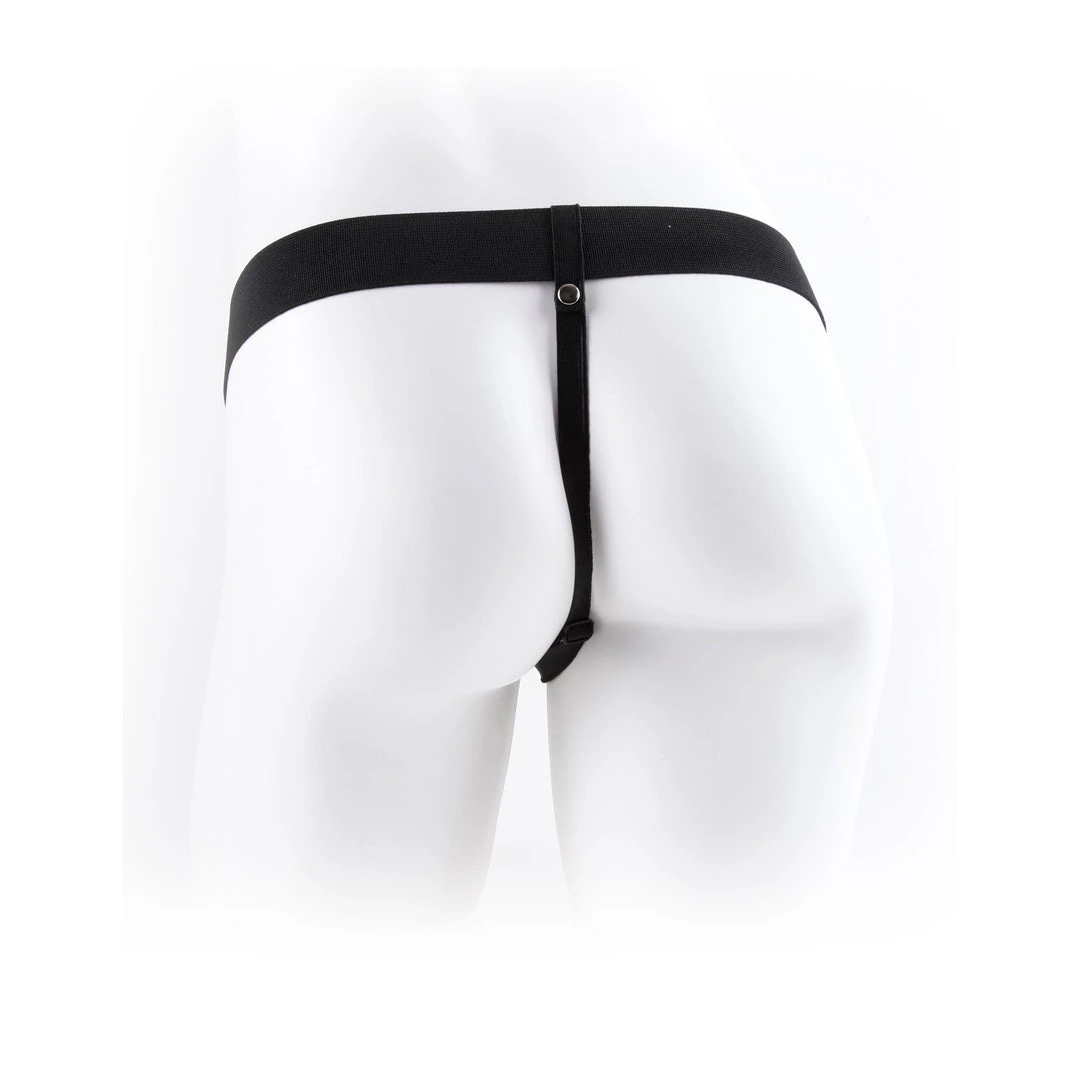 The hollow strap-on is attached to an adjustable, stretchy elastic band that closes around the waist and between the legs. Heavy-duty rivets keep the dildo attached to the harness, helping it stay in place even during more vigorous activities.