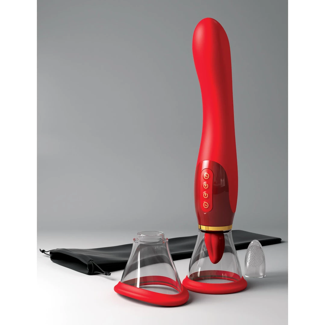 Providing 2 pleasure points to choose from, this to-die-for pleasure-giver licks, sucks and vibrates all at once to get you off. You can also do them one at a time for an all-around good time! The smooth, sensual handle at the other end doubles as a robust G-spot massager that reaches up and in for complete, breathtaking sex or masturbation. The intense suction tool can be used with either attachment for mind-blowing vaginal or nipple stimulation. Four powerful motors deliver one-of-a-kind stimulation, inside and out, and a simple push-button interface keeps you in charge of the intensity.
