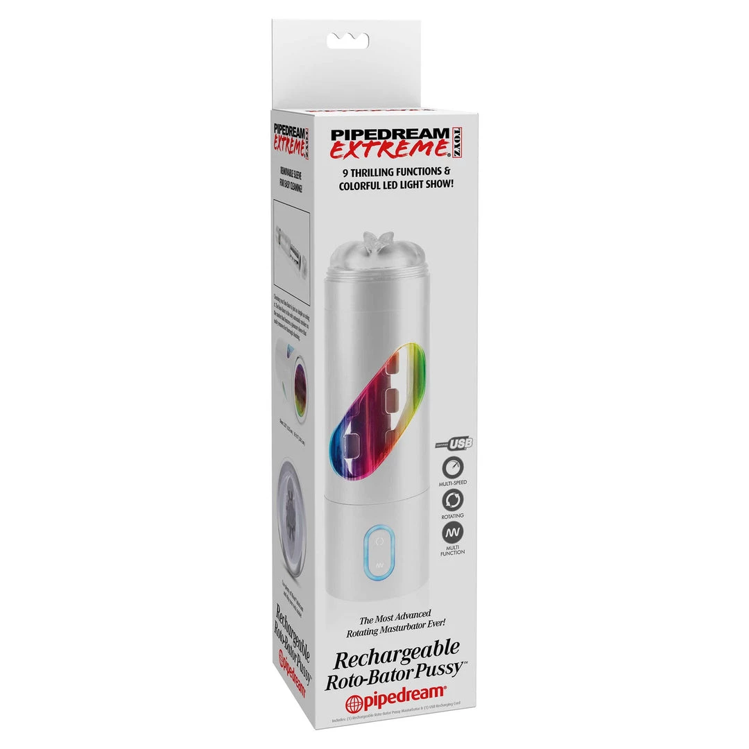 The Extreme Rechargeable Roto-Bator Pussy is created by Pipedream Products and features a unique rotating feature instead of the up-and-down motion of traditional masturbators. The stroker has an advanced rotation mechanism that provides nine rotation patterns and a reverse option that instantly changes the direction of the spinning motion, amplifying sensations. Each pattern has a different color LED light display, making the entire experience more pleasurable.