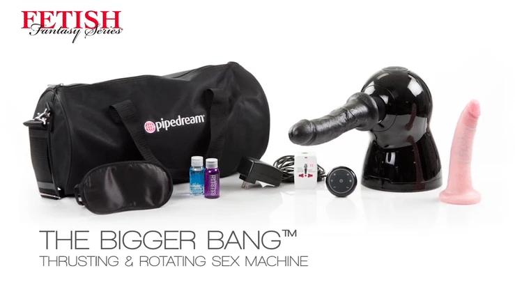 The device is not waterproof and should not be used around water. It comes with a universal power adaptor compatible with all power grids. The Bigger Bang Thrusting and Rotating Sex Machine is packed in a travel bag, a satin love mask, and the Moist Lotion lube and toy cleaner samples. The dildos can be cleaned with soapy water or any toy cleaner.