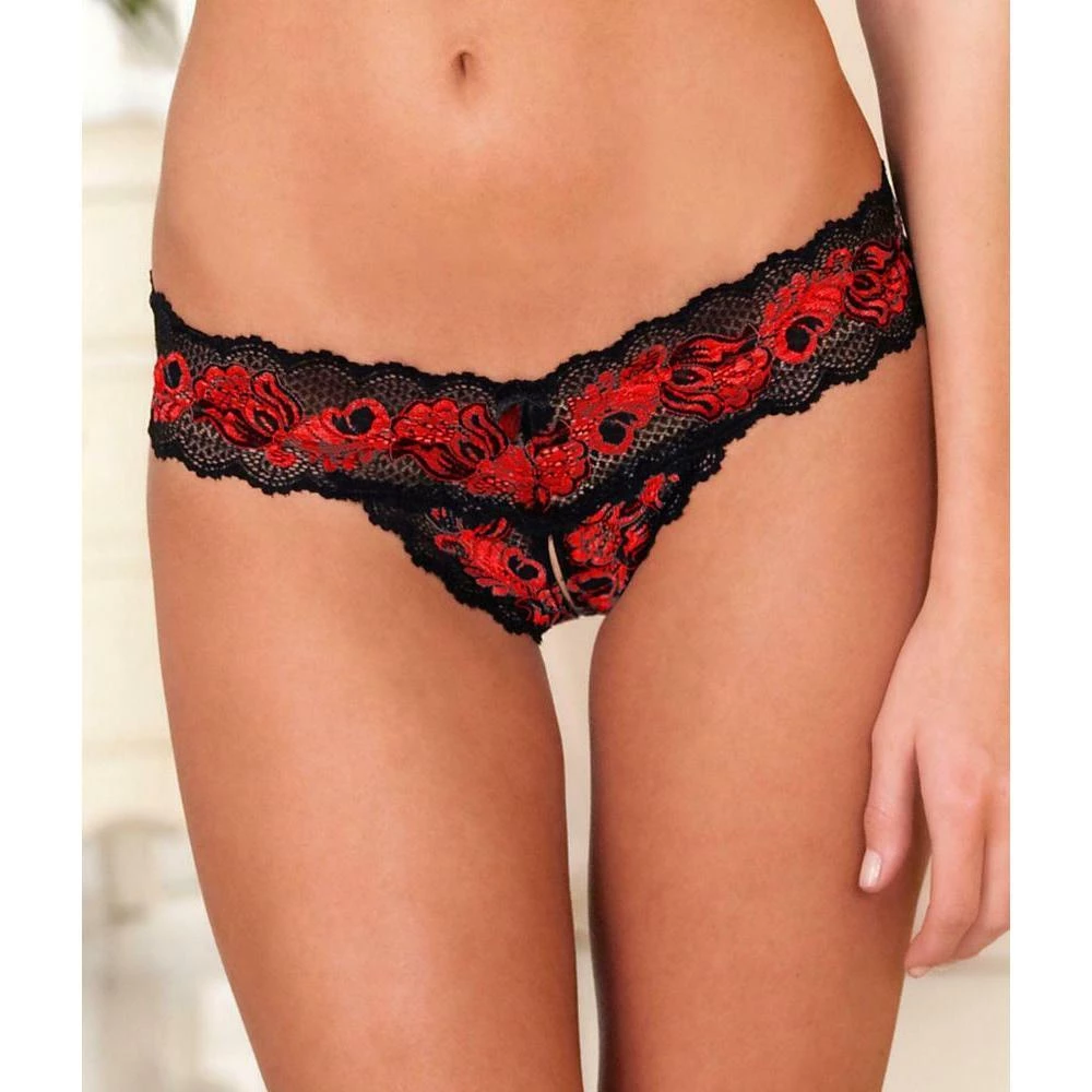 The low-rise panty has a thick elastic lace waistband for added comfort and a thong back. As the name suggests, the panty is crotchless for easy access in the heat of the moment.