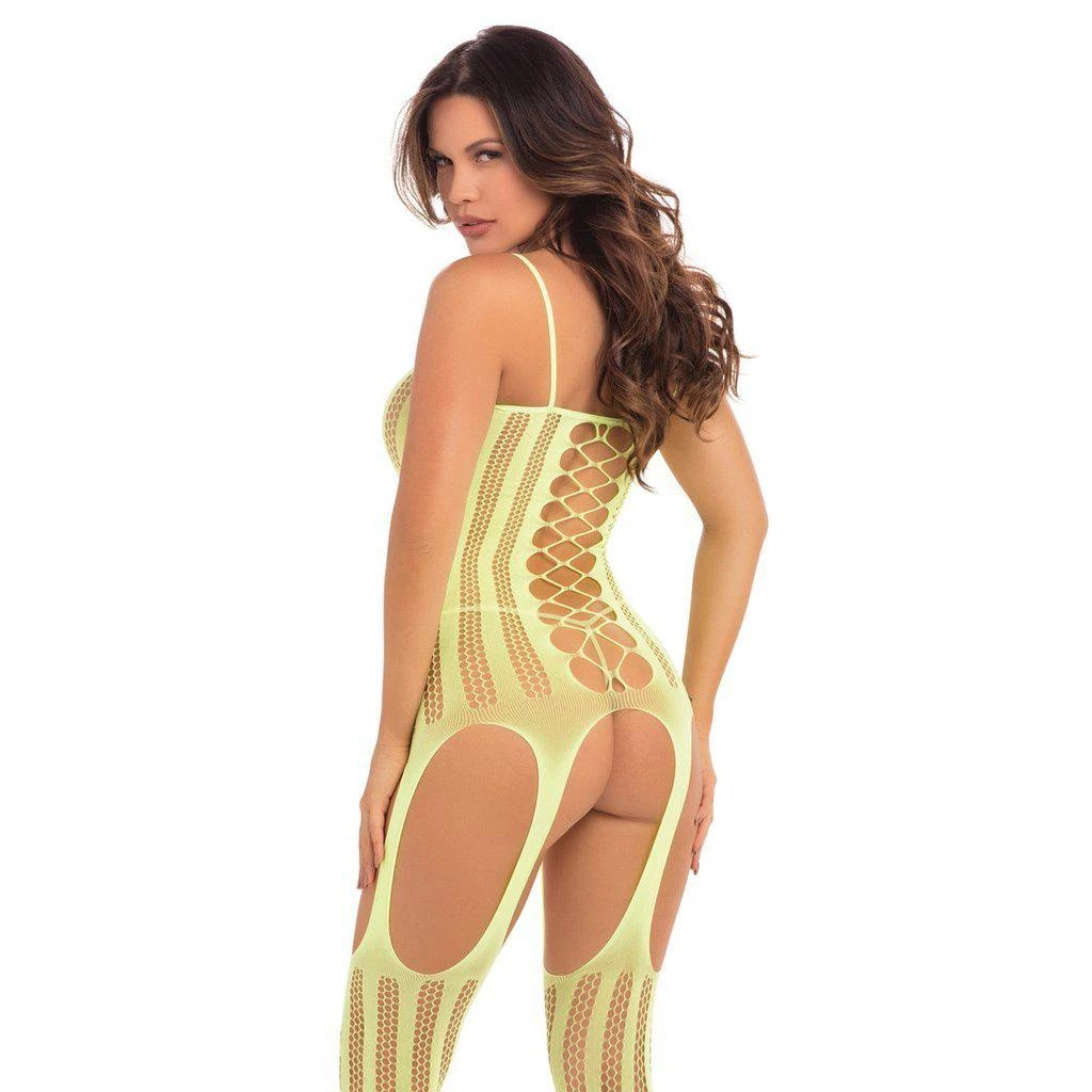 The Fake News Sexy Bodystocking is available in two fun and atypical colors – pink and yellow. The bodystocking features fishnet design and numerous openings that will show off a lot of skin. There’s a sexy crisscross design running all the way from your breasts to your crotch. The bodystocking also has large thigh openings and a completely exposed booty area in the back.
