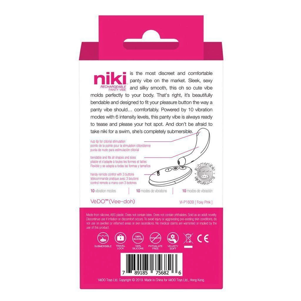 VeDO Niki is the most discreet and comfortable panty vibe on the market. Sleek, sexy and silky smooth, this oh so cute vibe molds perfectly to your body. That’s right, it’s beautifully bendable and designed to fit your pleasure button the way a panty vibe should…comfortably. Powered by a whopping 10 vibration modes with 6 intensity levels, this panty vibe is always ready to tease and please your hot spot.