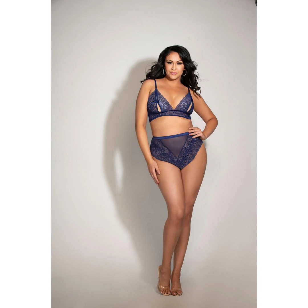 Midnight Kiss 2 Piece Bralette Set Navy from Seven Til Midnight lingerie. This romantic plus size lace bra set features sheer triangle cups with peek-a-boos, satin bow accents, adjustable shoulder straps with gold hardware, hook back closures, matching high waisted panty with sheer triangular panel and a satin ribbon tie back closure.