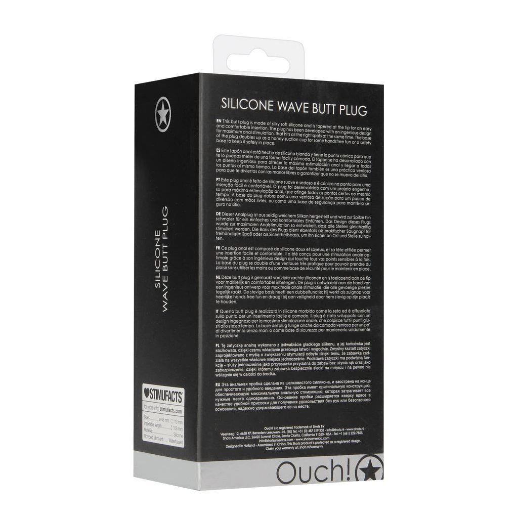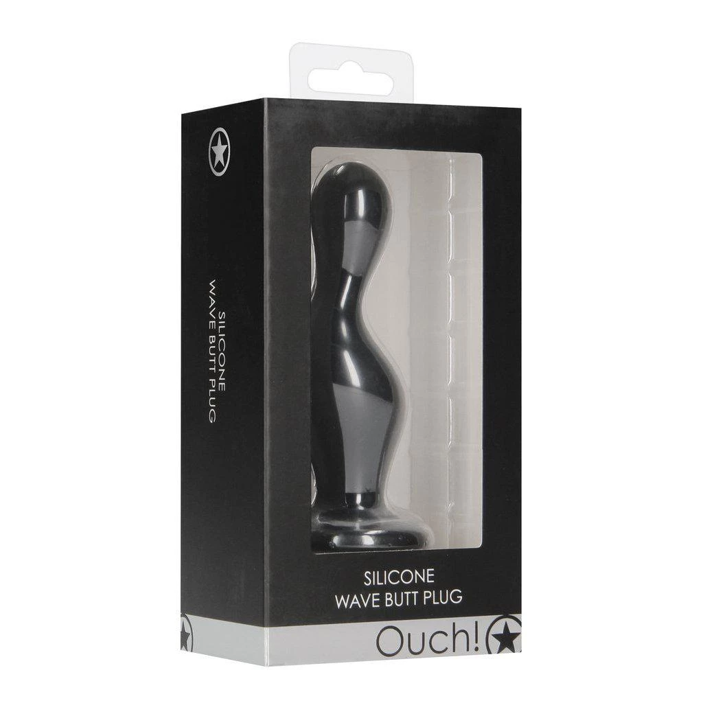 Ouch! Silicone Wave Butt Plug Black from Shots Toys. This butt plug is made of silky soft silicone and is tapered at the tip for an easy and comfortable insertion. The plug has been developed with an ingenious design for maximum anal stimulation, that hits all the right spots at the same time. The base of the plug doubles up as a handy suction cup for some hands free fun or a safety base to keep it safely in place.