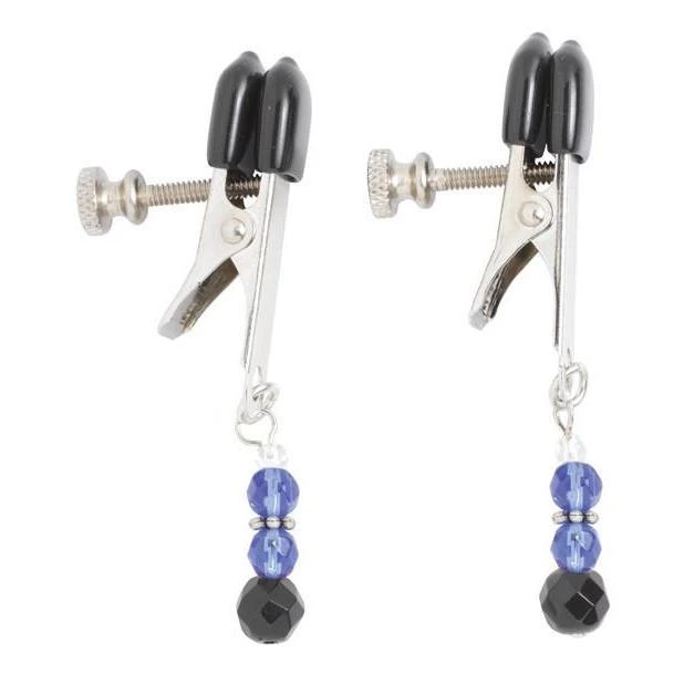 New to nipple play? These nipple clips are perfect for beginners. Twist the screw on the side to allow you the choice of light pressure of full-strength intensity. Firm-but-gentle, these adjustable clamps pinch the nipples with just the right amount of pressure to slowly build from a warm tingle to a titillating ache. Swaying from each silver clamp is a string of decorative blue jewels – in addition to adding some gorgeous bling to your fling, the weight adds further sensation to resonate through your nipples with every subtle movement.