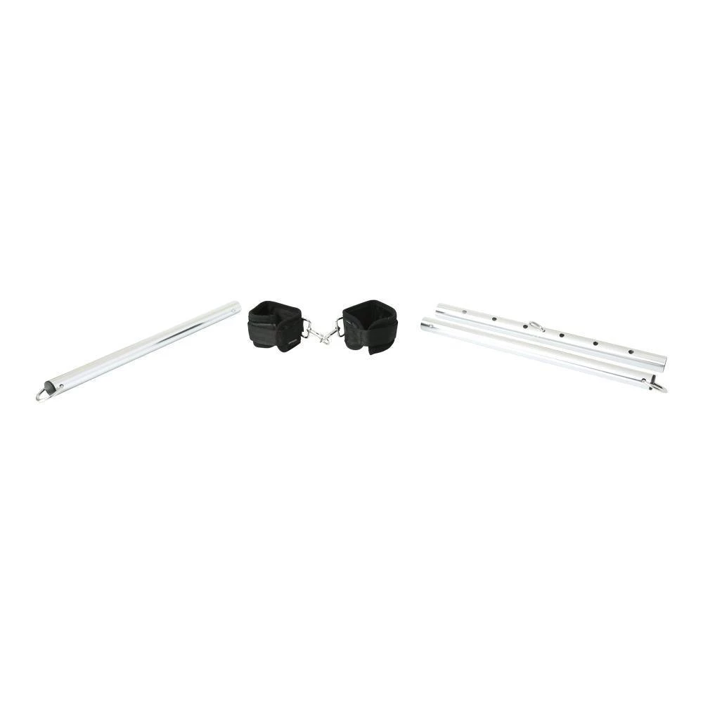 Details: breaks down into three pieces for easy storage and travel. Comes with a middle D-Ring clip for additional attachments. Includes two adjustable cuffs for ankles or wrists, which attach to each end of the Bar. Sportsheets Expandable Spreader Bar adjusts from 29 inches to 37 inches. Expand your relationship with this bondage tool. Materials: Aluminum, polyester fabric, polypropylene webbing, nickel free metal hardware, polypropylene plastic PP, hook and loop.