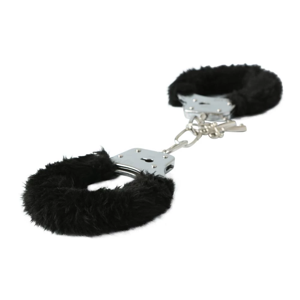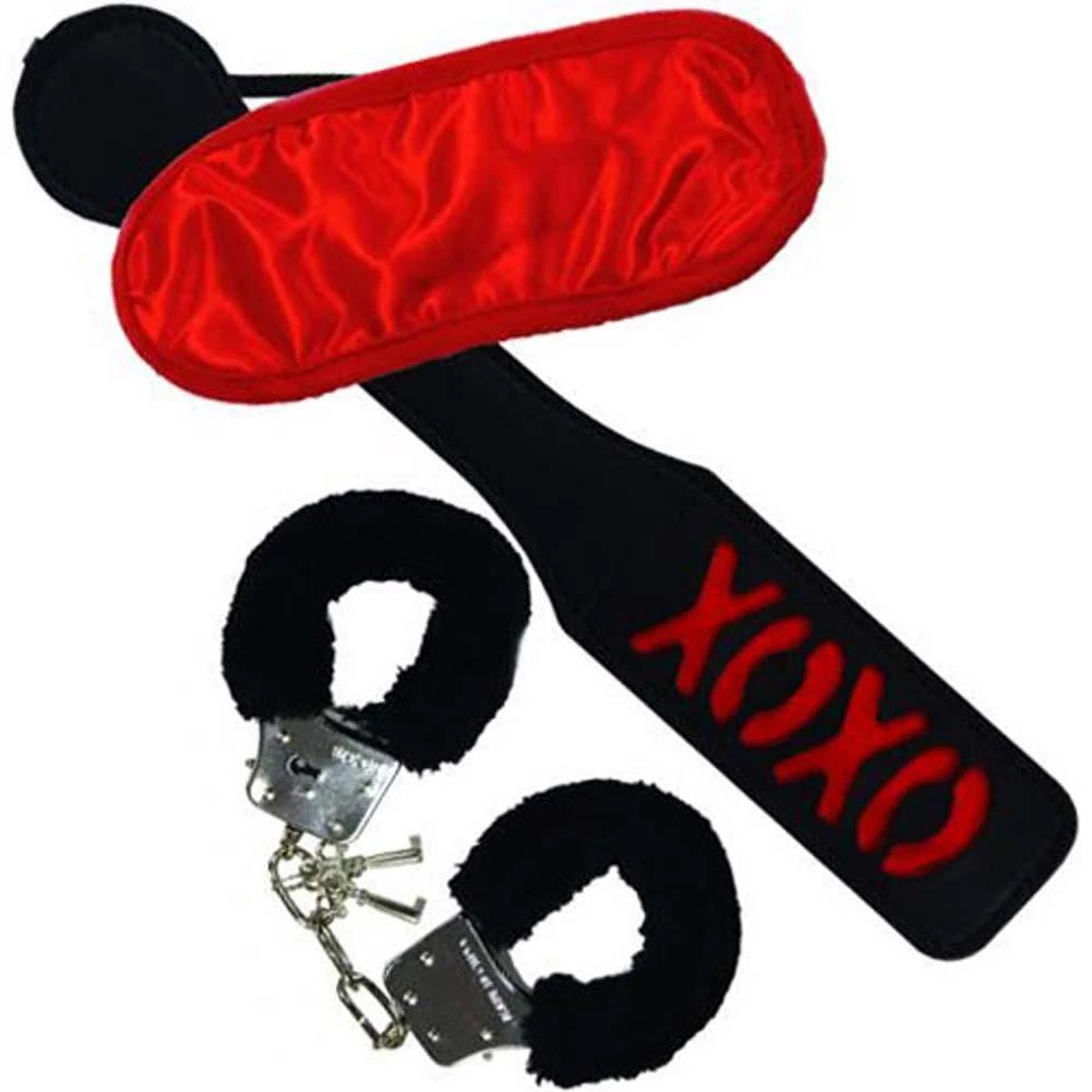 - Includes furry cuffs, a leather paddle and a silky satin love mask