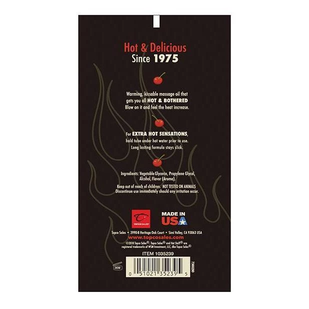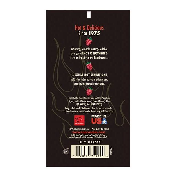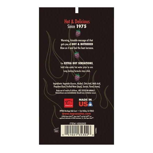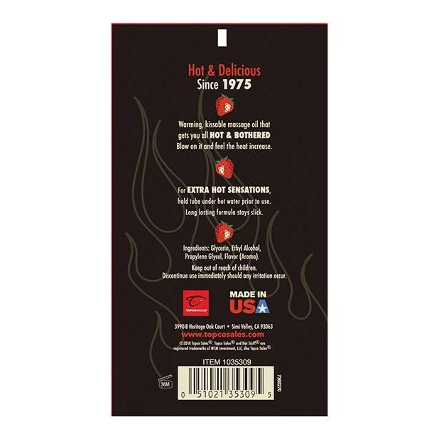 Hot Stuff Warming Oil provides slippery fun that warms with your breath or touch. It is water based, edible, and non-staining. Contains 6 ounces. Try all the great flavors!