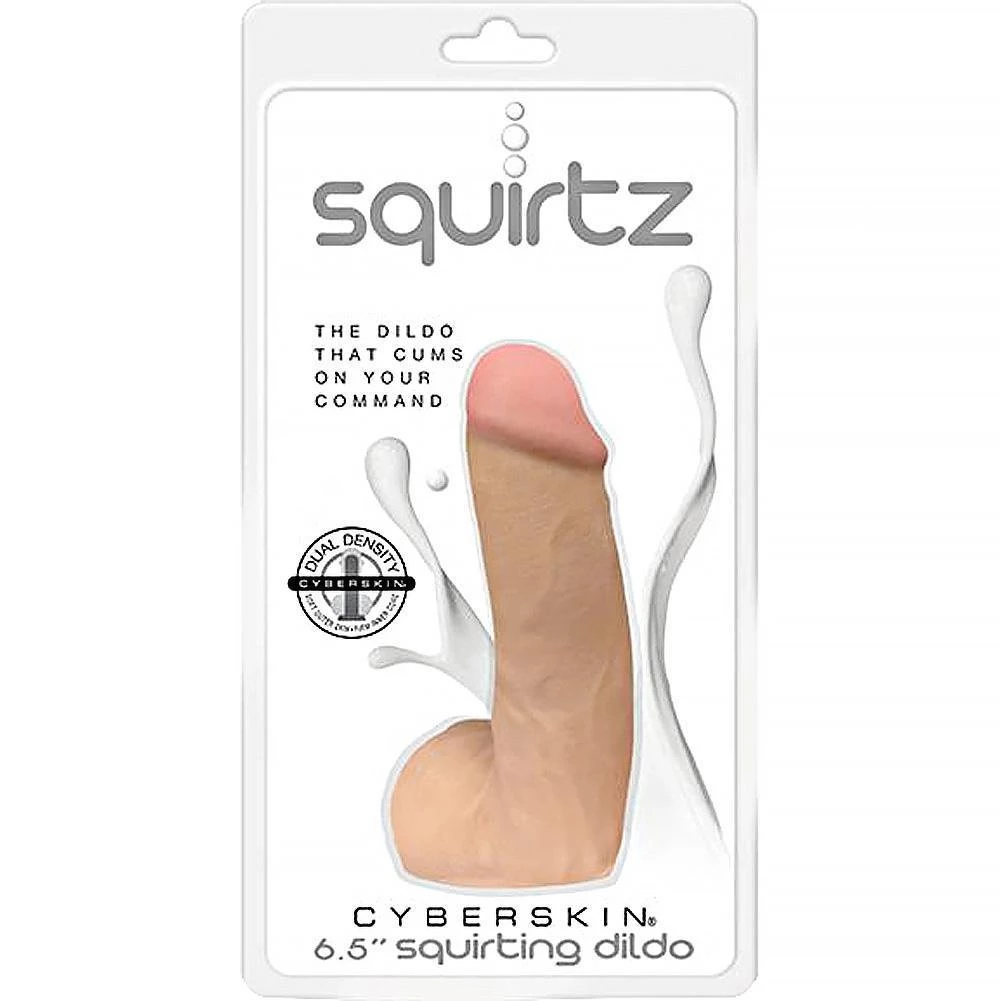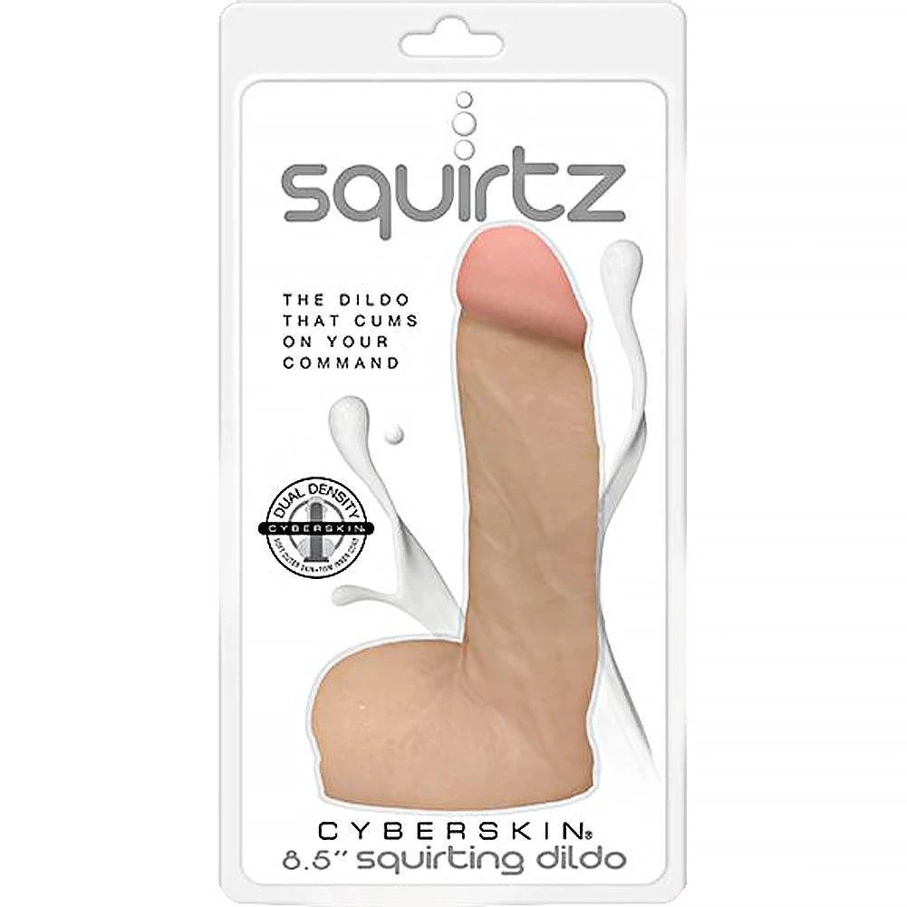 - Dual density, Cyberskin®, realistic, and hand-finished dildo with Squirtz technology releasing fluid from the balls up through the shaft with a simple squeeze